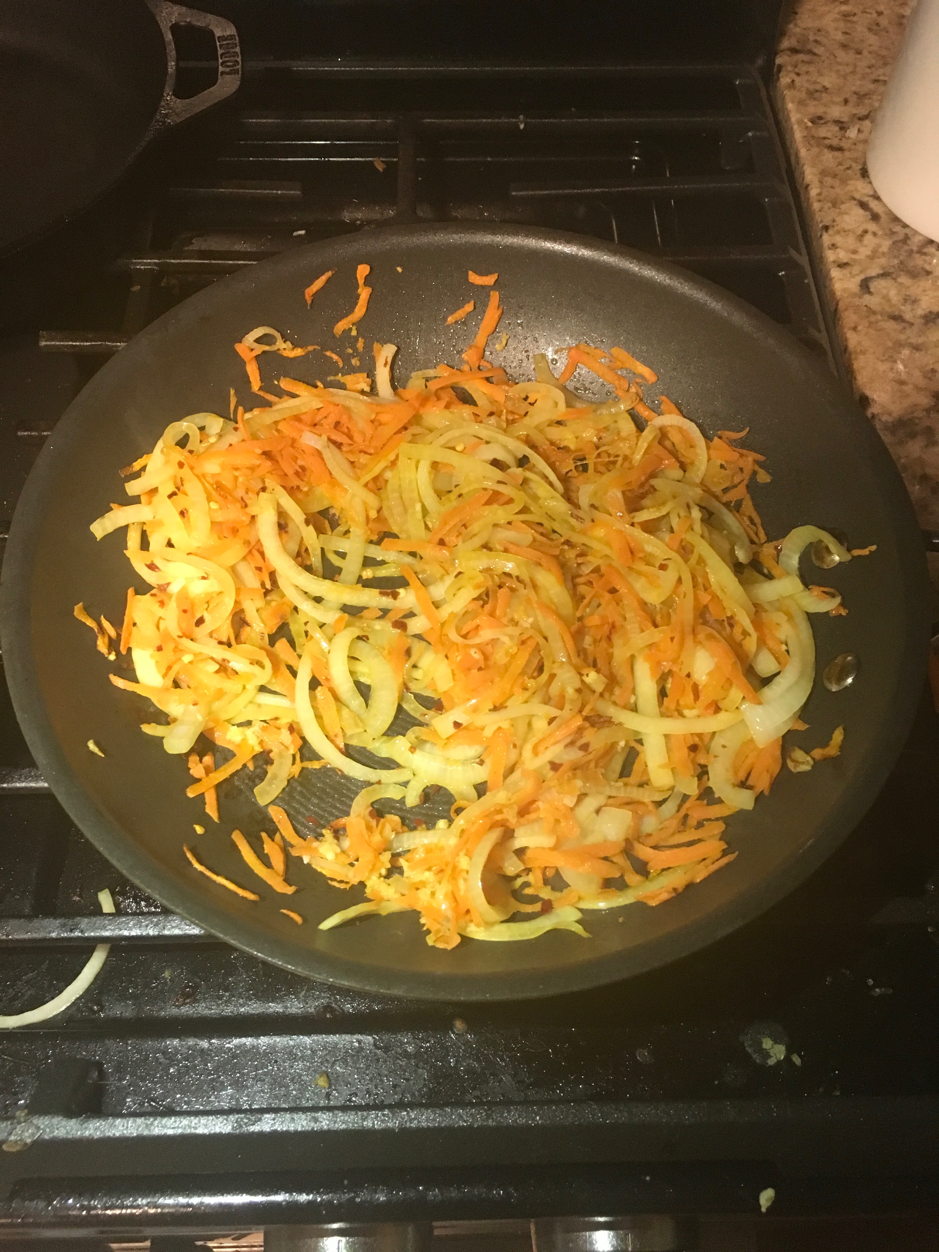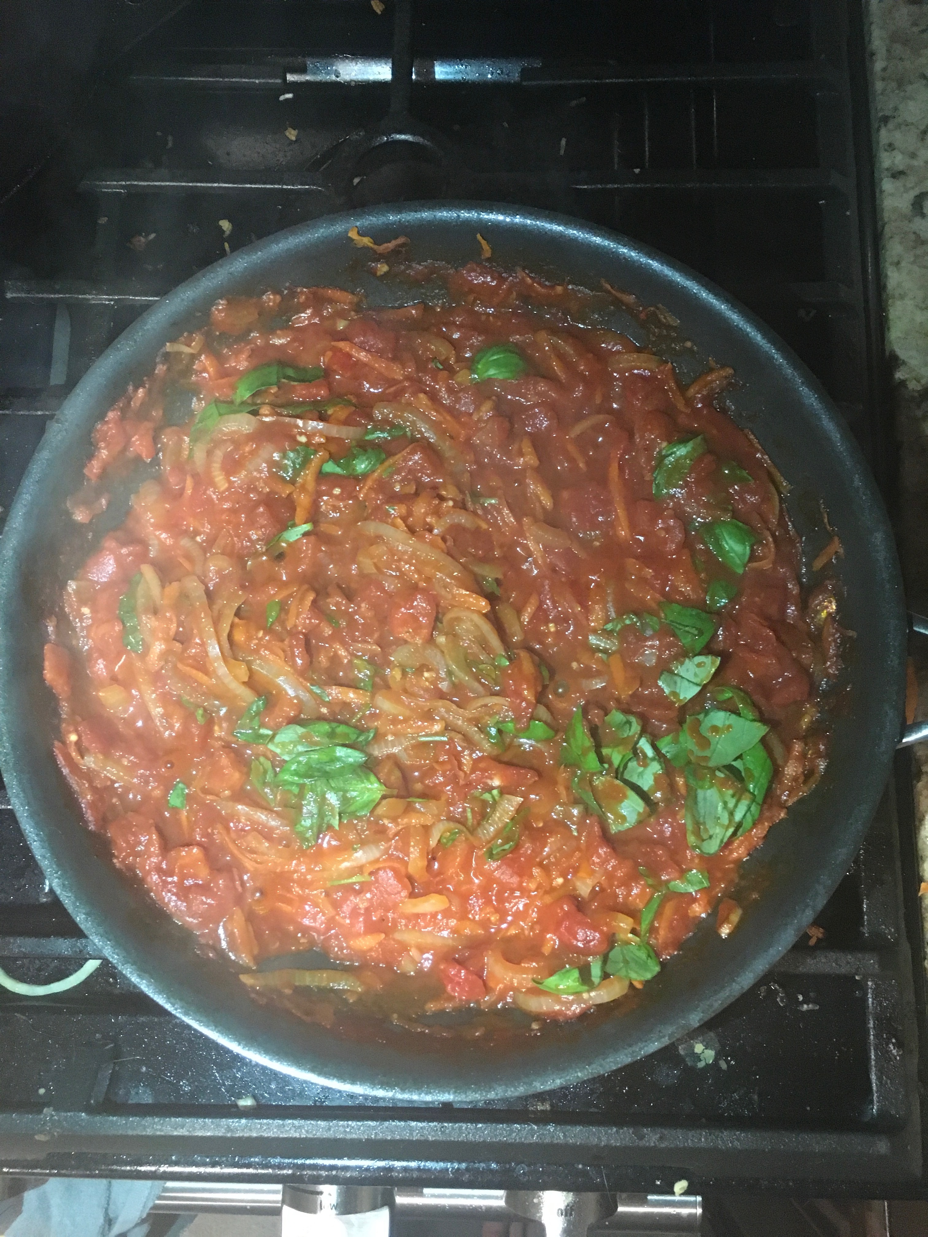 In a good sized skillet, heat your olive oil. Add the onion, garlic, carrot, salt, and red pepper flakes. Cook until the onions are clear. Add the sugar and tomatoes with their juices.