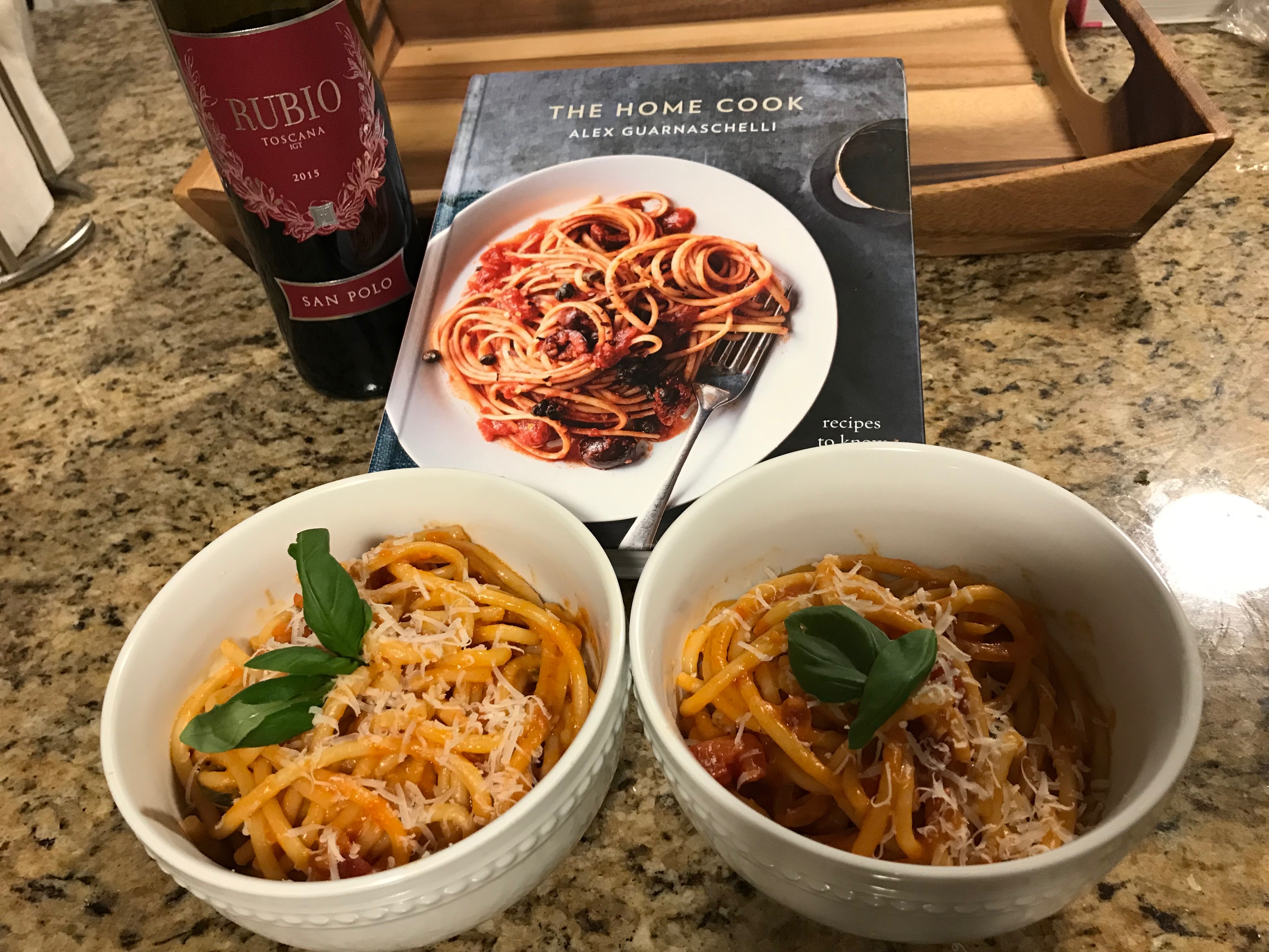 A common debate in our house whenever we make spaghetti is his spaghetti or mine. His spaghetti is a sauce from an amazing deep dish pizza that he cooked for me on one of our first dates, mine is one I watched my mom make growing up that involves lots of herbs. Last night, we compromised with the spaghetti of one of my favorite Food Network chefs, Alex Guarnaschelli. I recently ordered her *signed* cookbook and was eager to get to work.