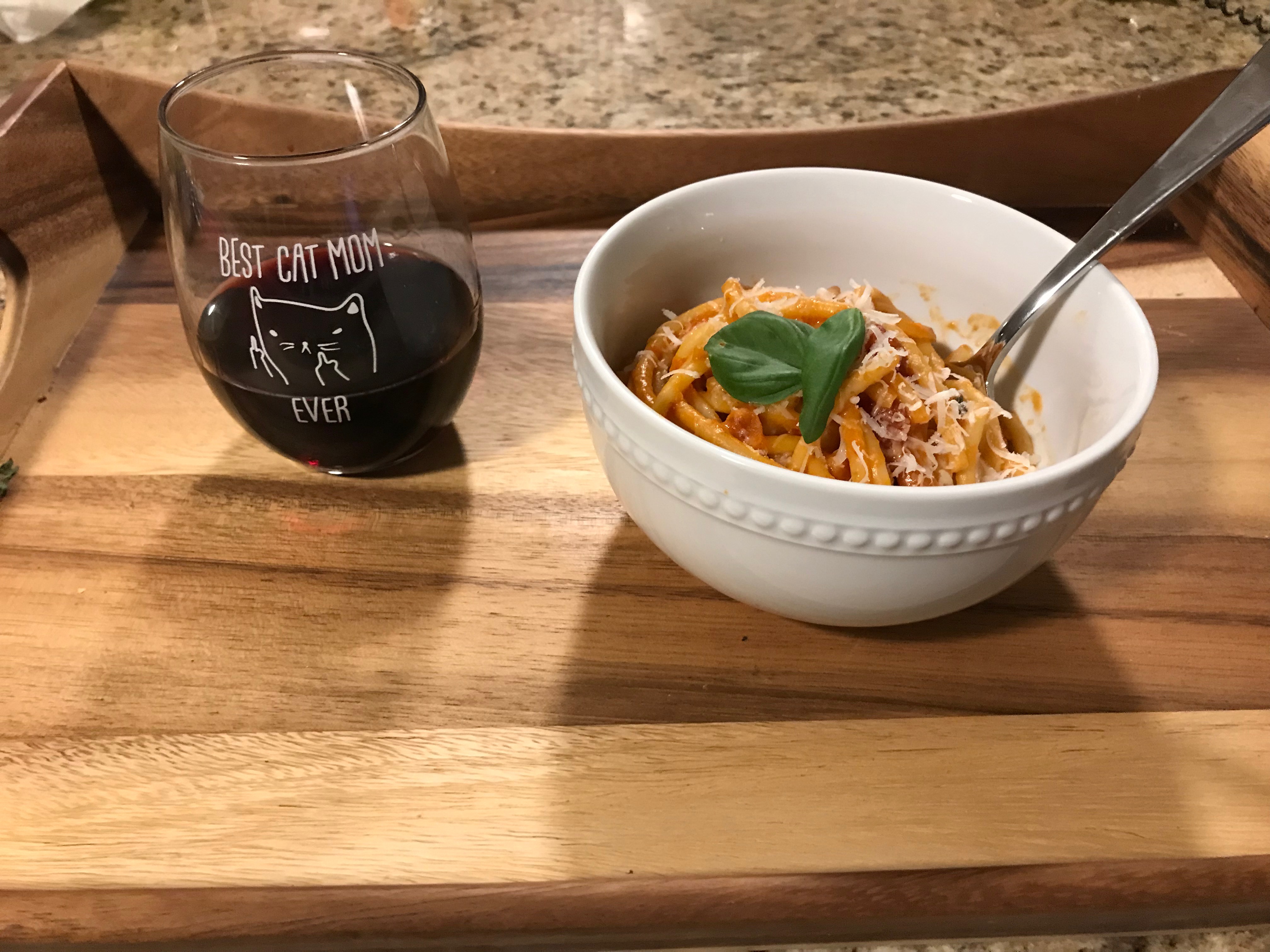 This recipe is a great twist on classic, sweet, and spicy. We used her requested Bucanti pasta, which was good and thick. It also had a hole in the middle which was pretty amusing. The sauce stuck so well to the pasta, and we weren’t left with lots of sauce in the bottom of our bowls and no noodles.