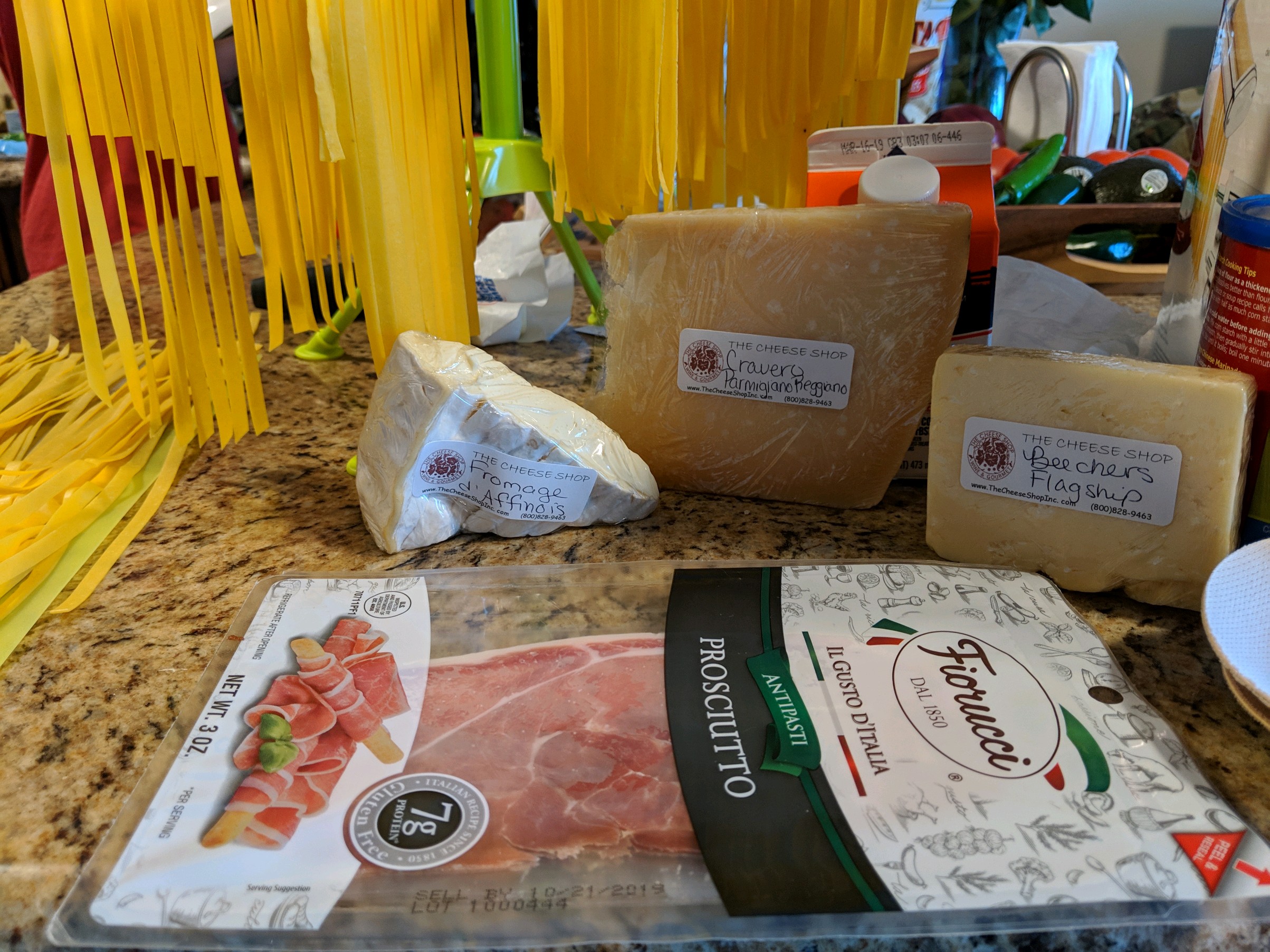 Making my own pasta was so fun, that I just had to do it again last week! We spent the day before going into Carmel-by-the-Sea and going to a cheese shop. Knowing we were going to make Fettuccine the next day, we sampled several cheeses that would work well with the pasta. We settled on Beechers Flagship cheese. Beechers started in Pikes Place Market, which is one of my favorite places ever. It had a good, sharp, nutty flavor to it and crumbled perfectly for easy melting in the sauce. The other cheese we used for the sauce was Fromager d’ Affinois which is very similar to a Brie cheese in texture but even smoother! I used it in place of half of the heavy cream in the original recipe. The last cheese we got was a Cravero Parmiginano Reggiano. We just used this to sprinkle on top.