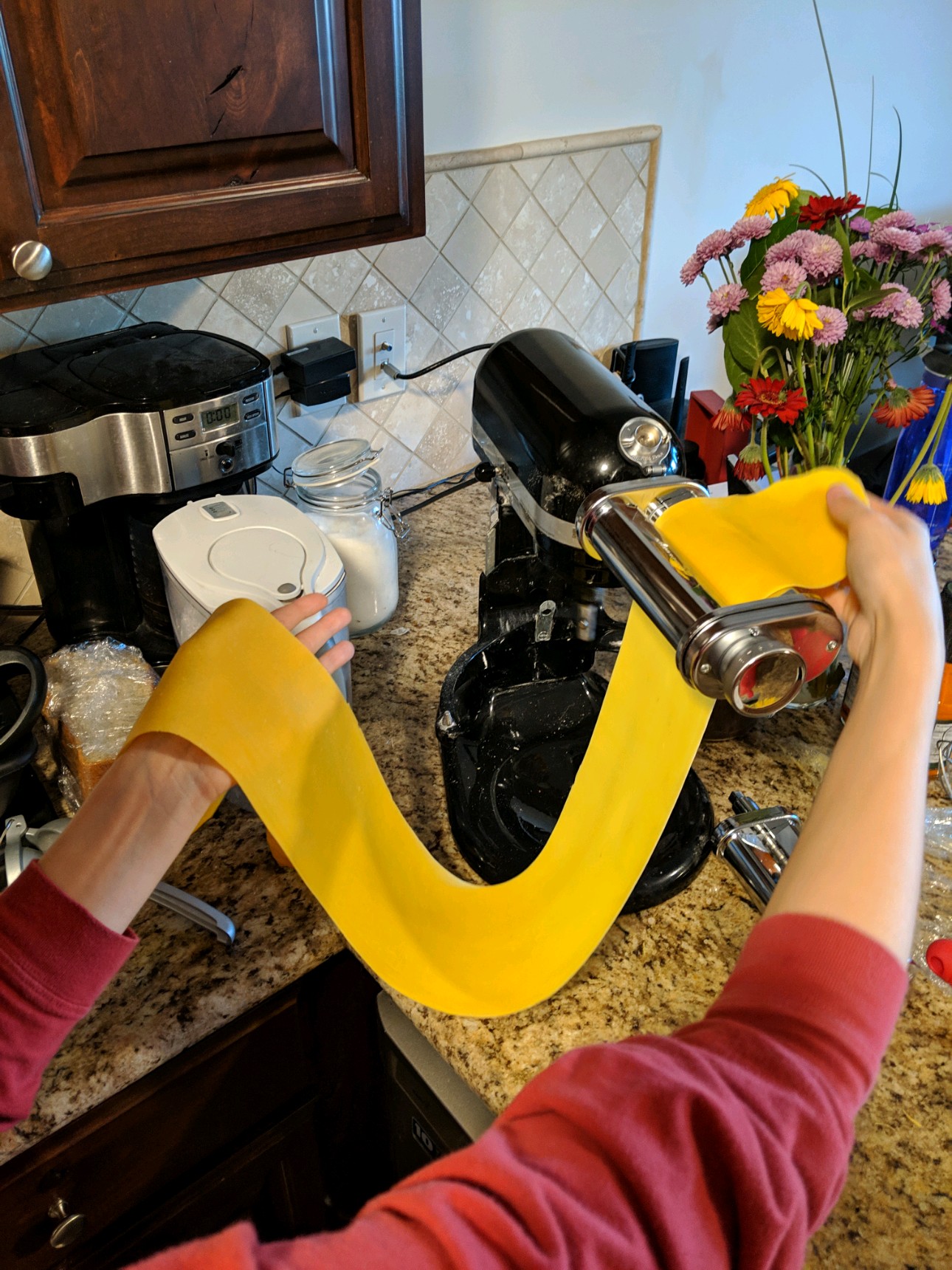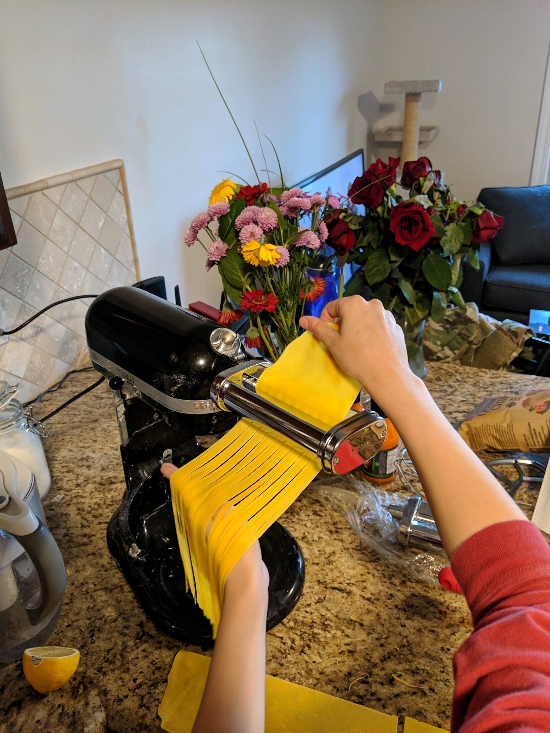 For the pasta, I used the same egg dough recipe I posted a couple weeks ago. This time, to separate the eggs, I used a slotted spoon over a bowl. So much easier!