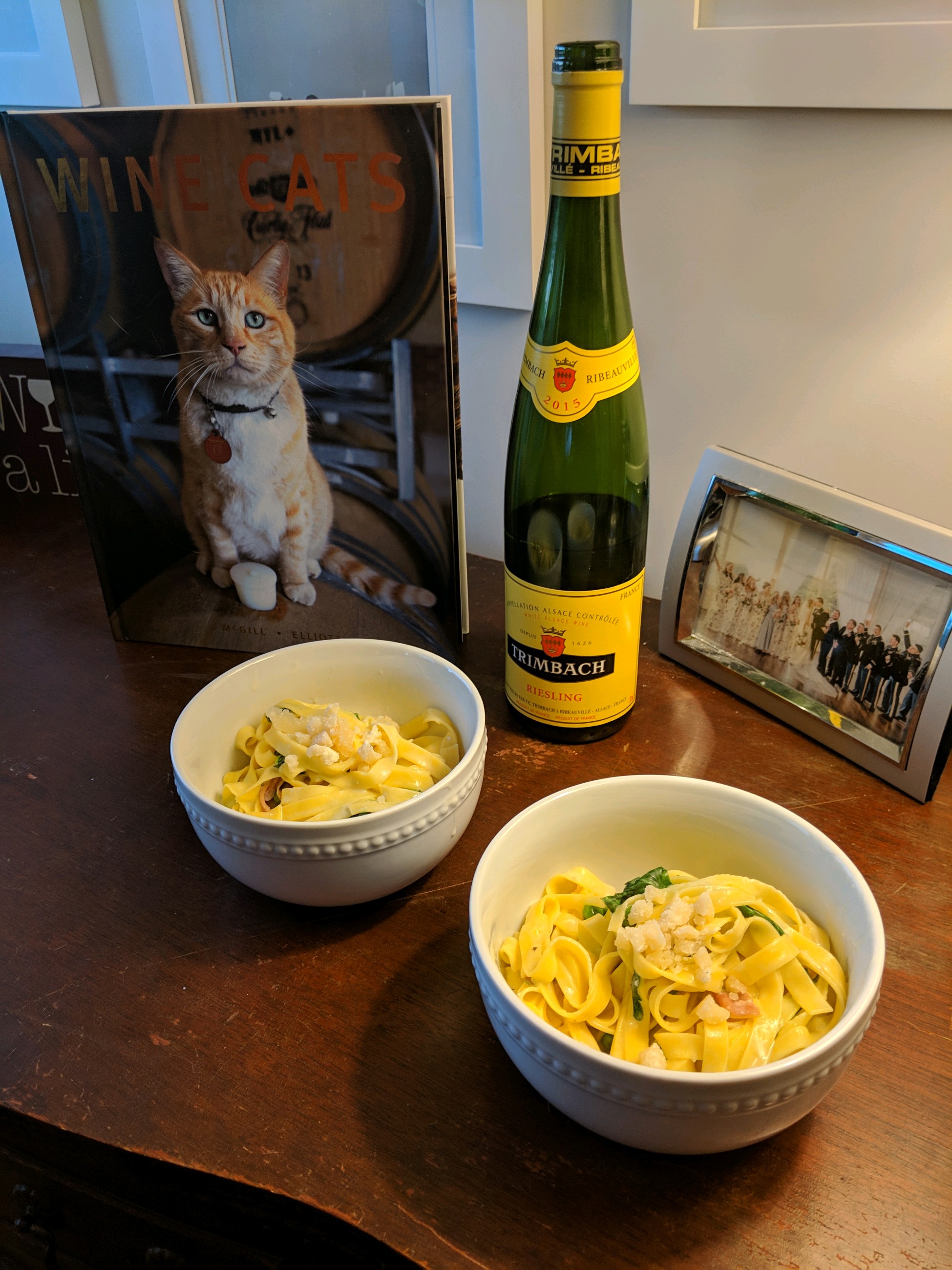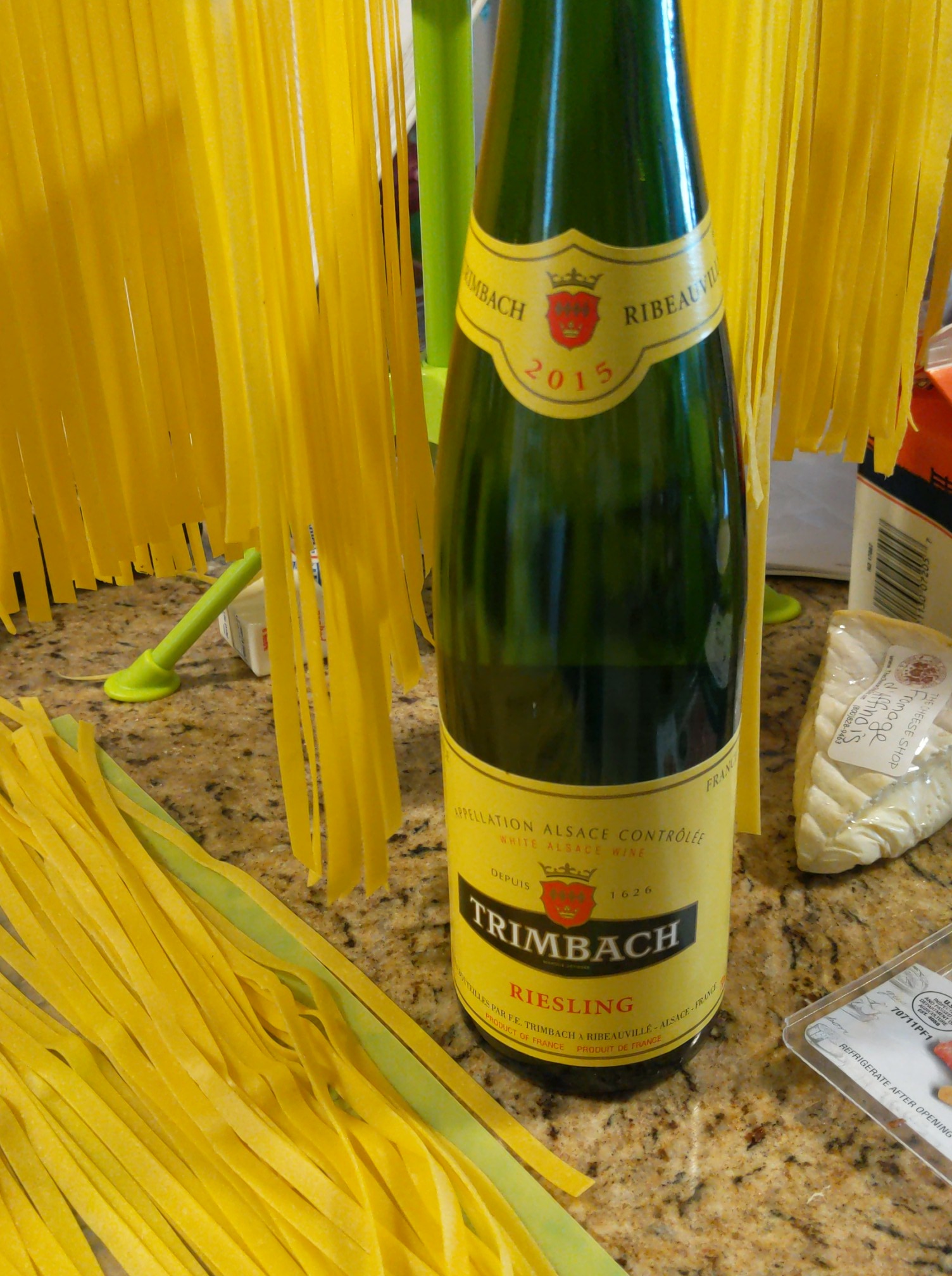 This weeks wine was a Riesling. My usual first thought it that Riesling is a super sweet wine, but that is not always the case. This particular Riesling is French and on the drier side. It has a lot of apple notes, and is very crisp. It was perfect for our pasta, because it left you wanting a next sip after a bite of food! This particular Riesling lingers just long enough so that you really get to taste the depth of flavor.