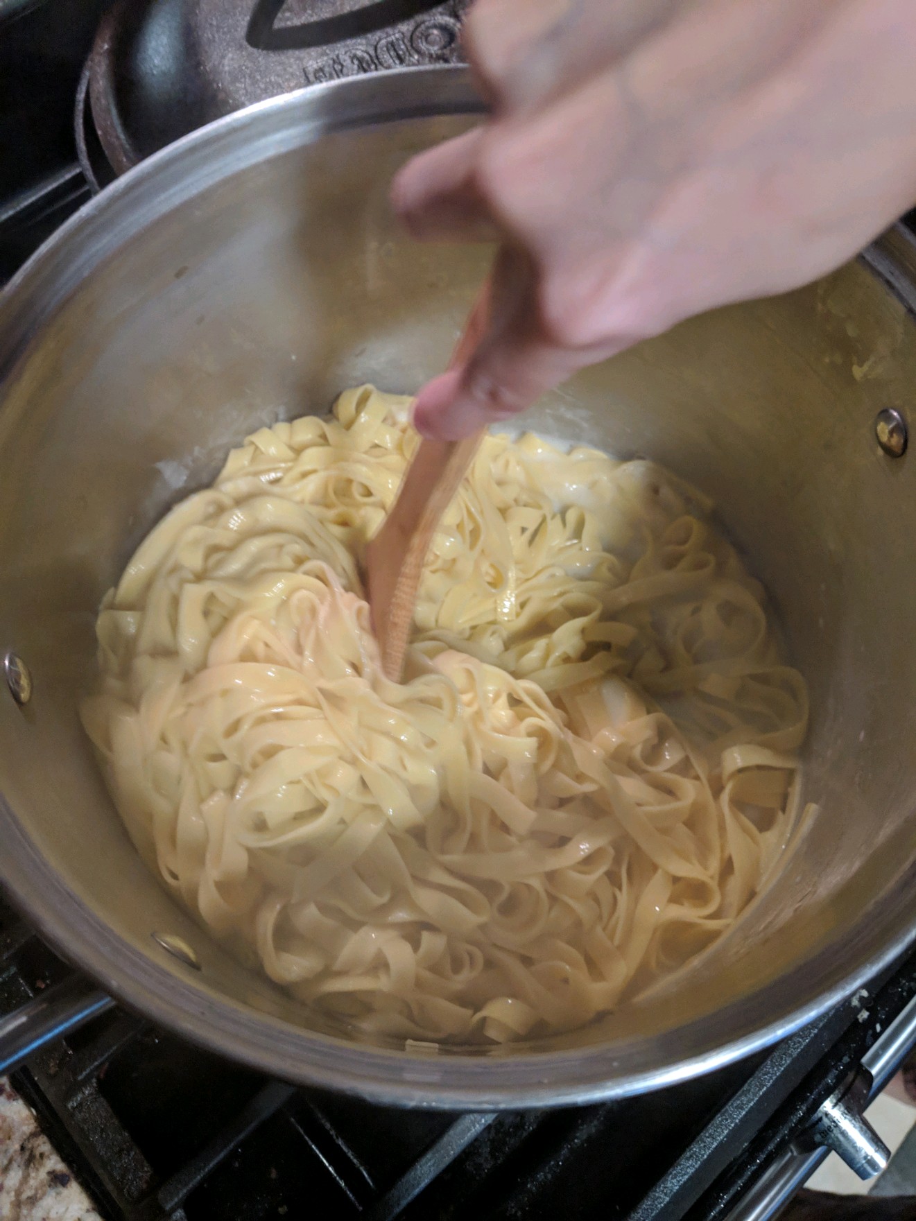 Fresh pasta cooks quickly, I think we only cooked it for 3 minutes. We also saved 2 cups of pasta water, it’s good pasta ethics!