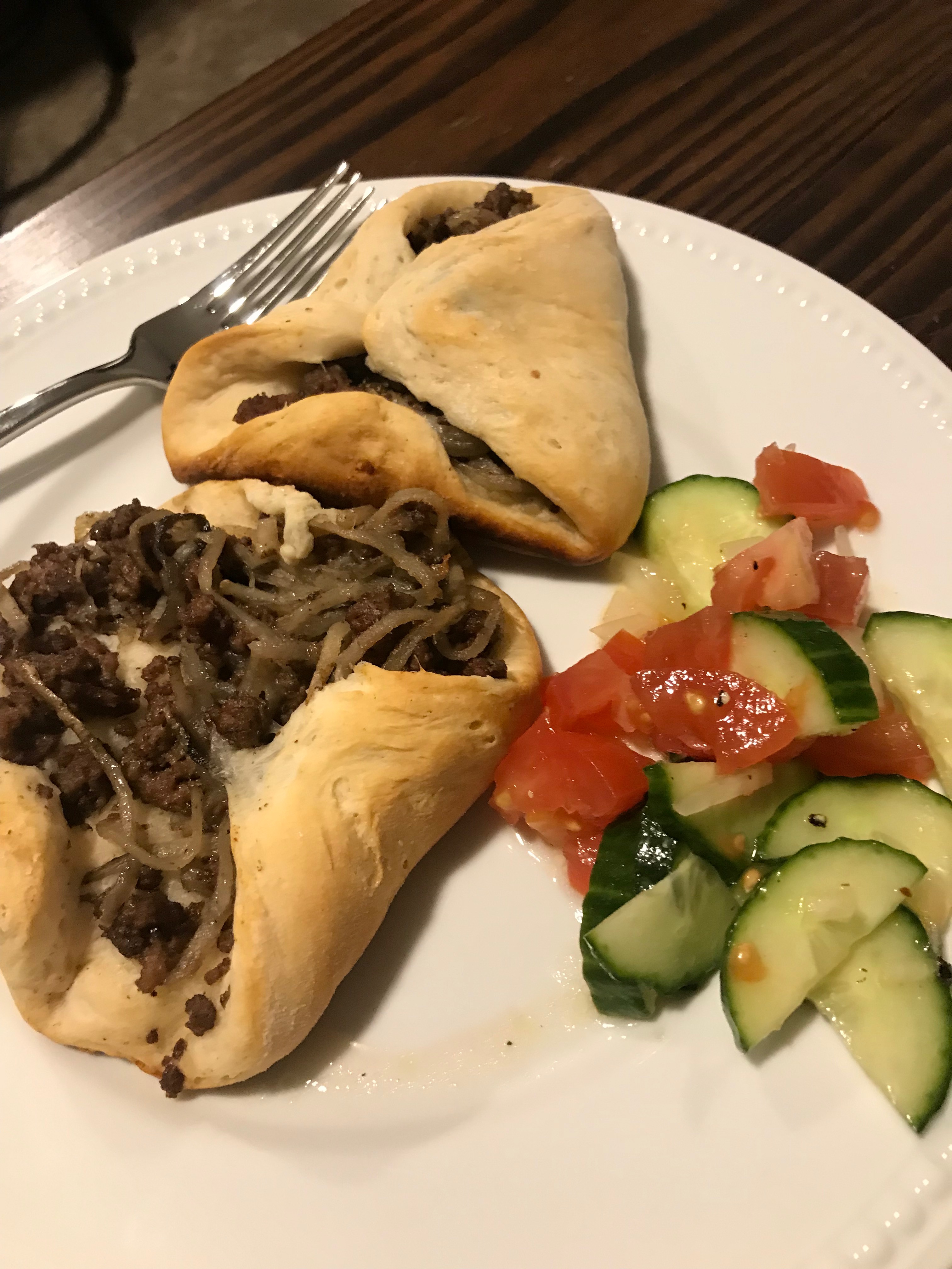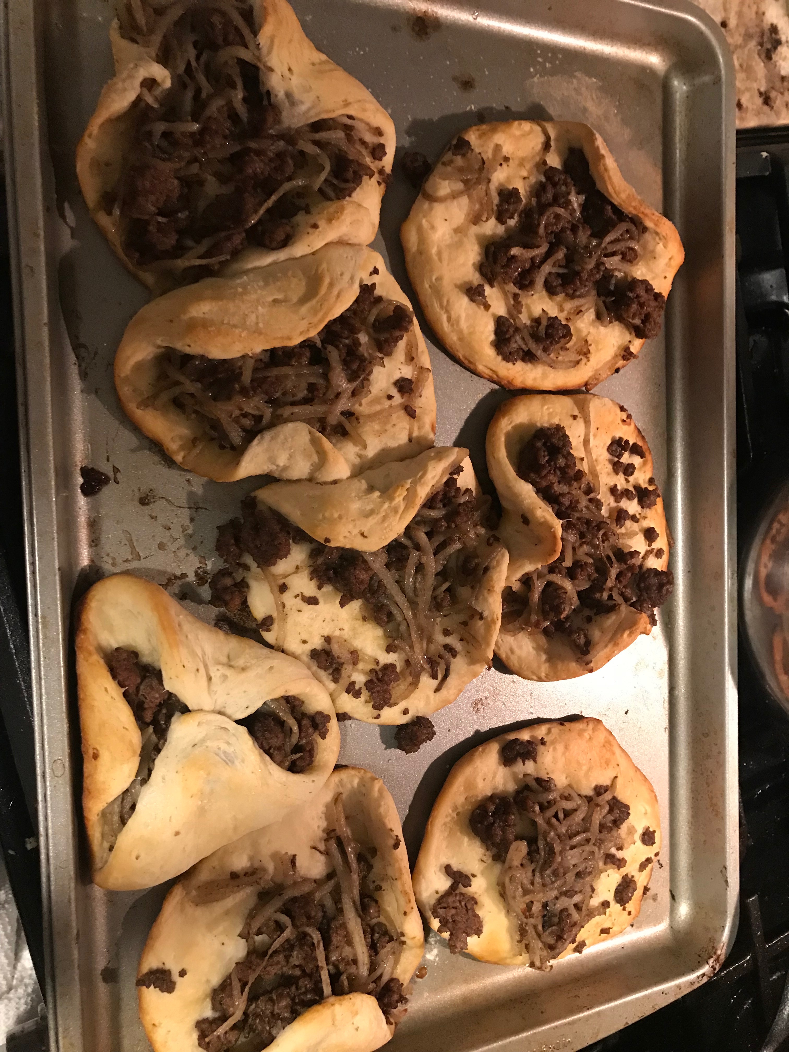 They’re supposed to look like neat little triangular packages, and I think my mistake was in overlapping the top instead of pinching the sides. The directions got super confusing and we totally goofed. Oh well, lesson learned! Our oven also burned the heck out of one of the trays. No idea what happened there. Next time I’m going to add some more seasoning to the meat pies, and maybe a sauce of some sort. It was all sort of dry and tasteless.