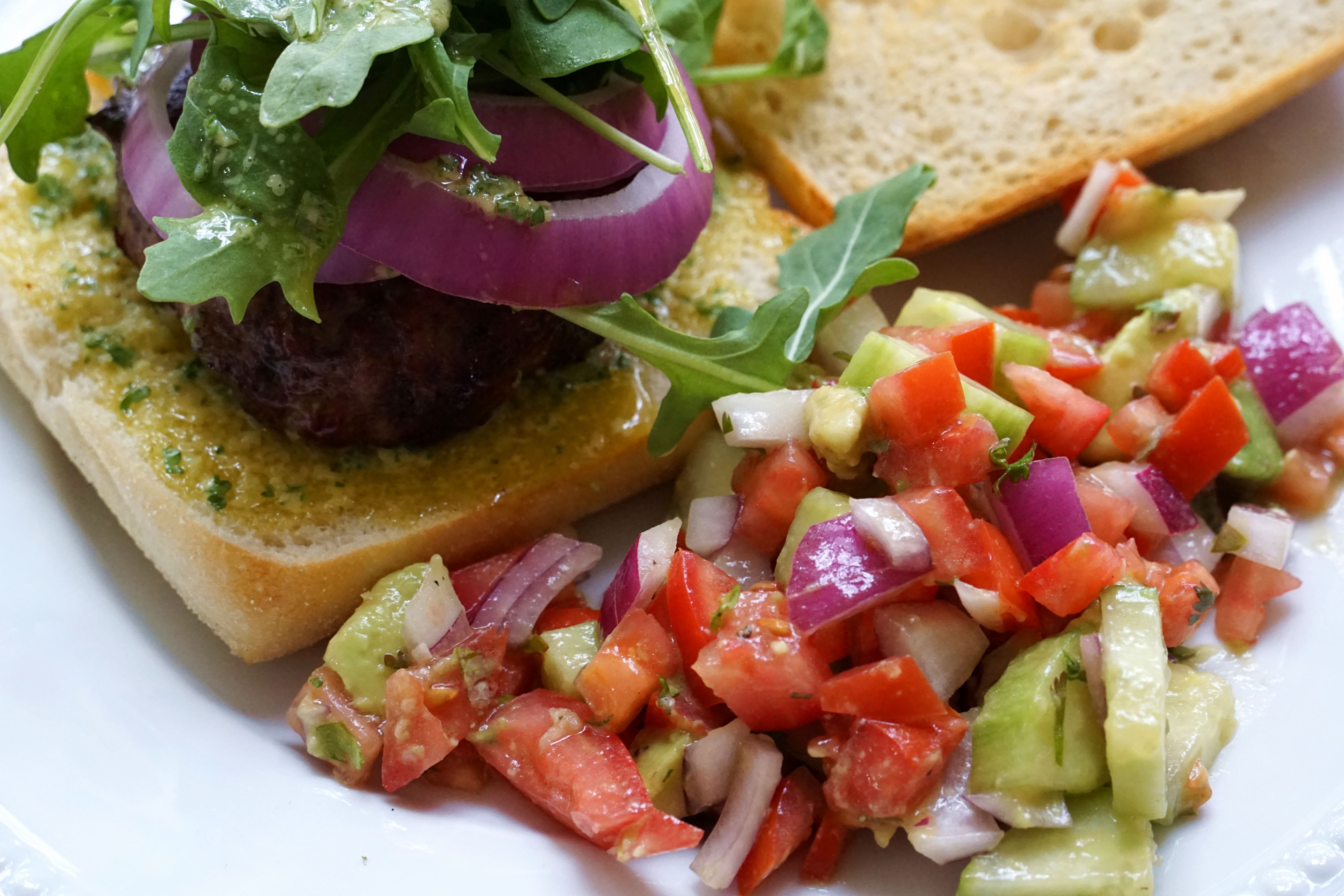 Toss the cucumber, tomatoes, avocado, onion, garlic, and cilantro in a large bowl with the lemon juice, salt, pepper, and olive oil. Serve immediately or keep it in the fridge while you cook the burgers. The avocado’s won’t keep!