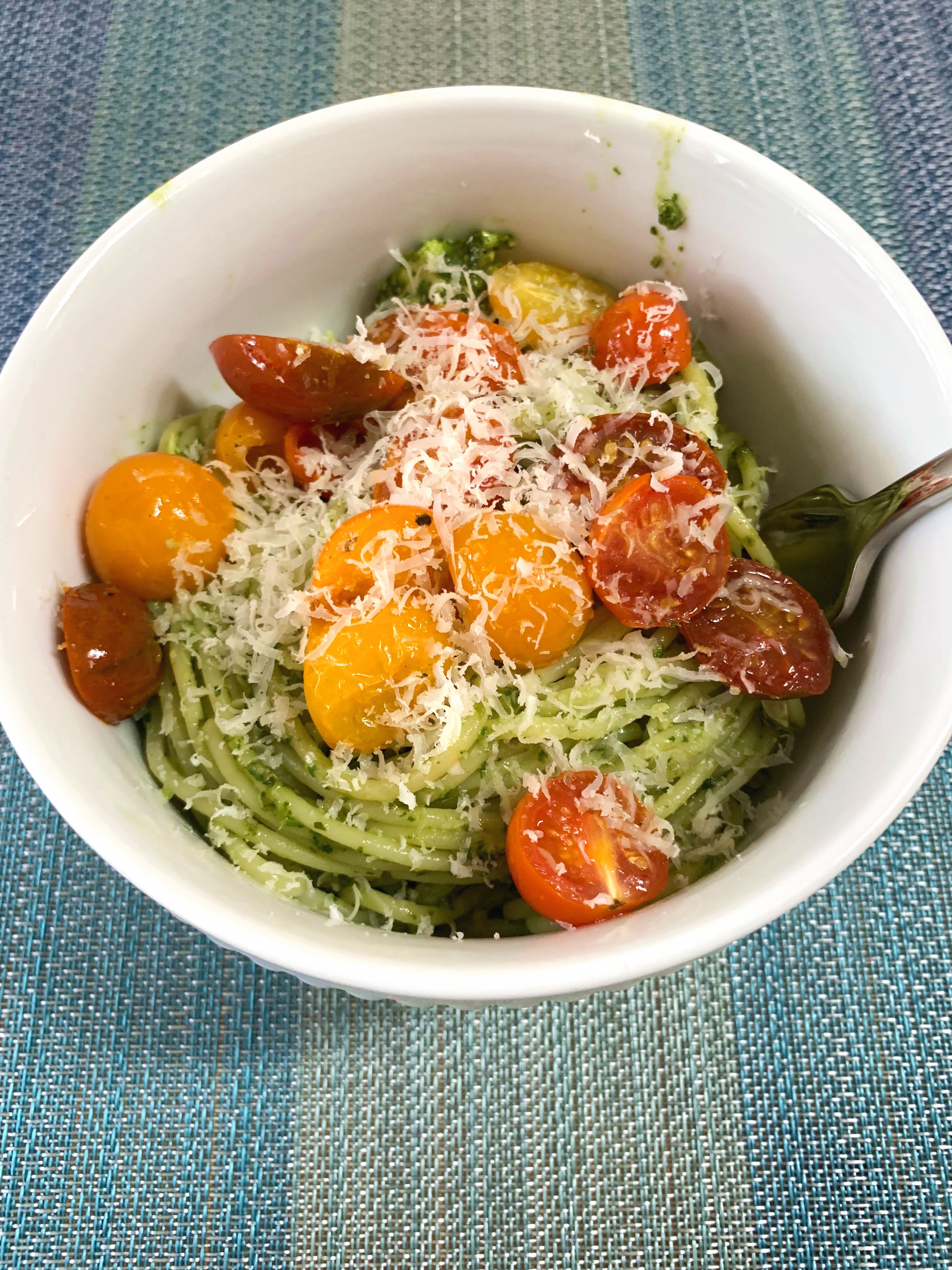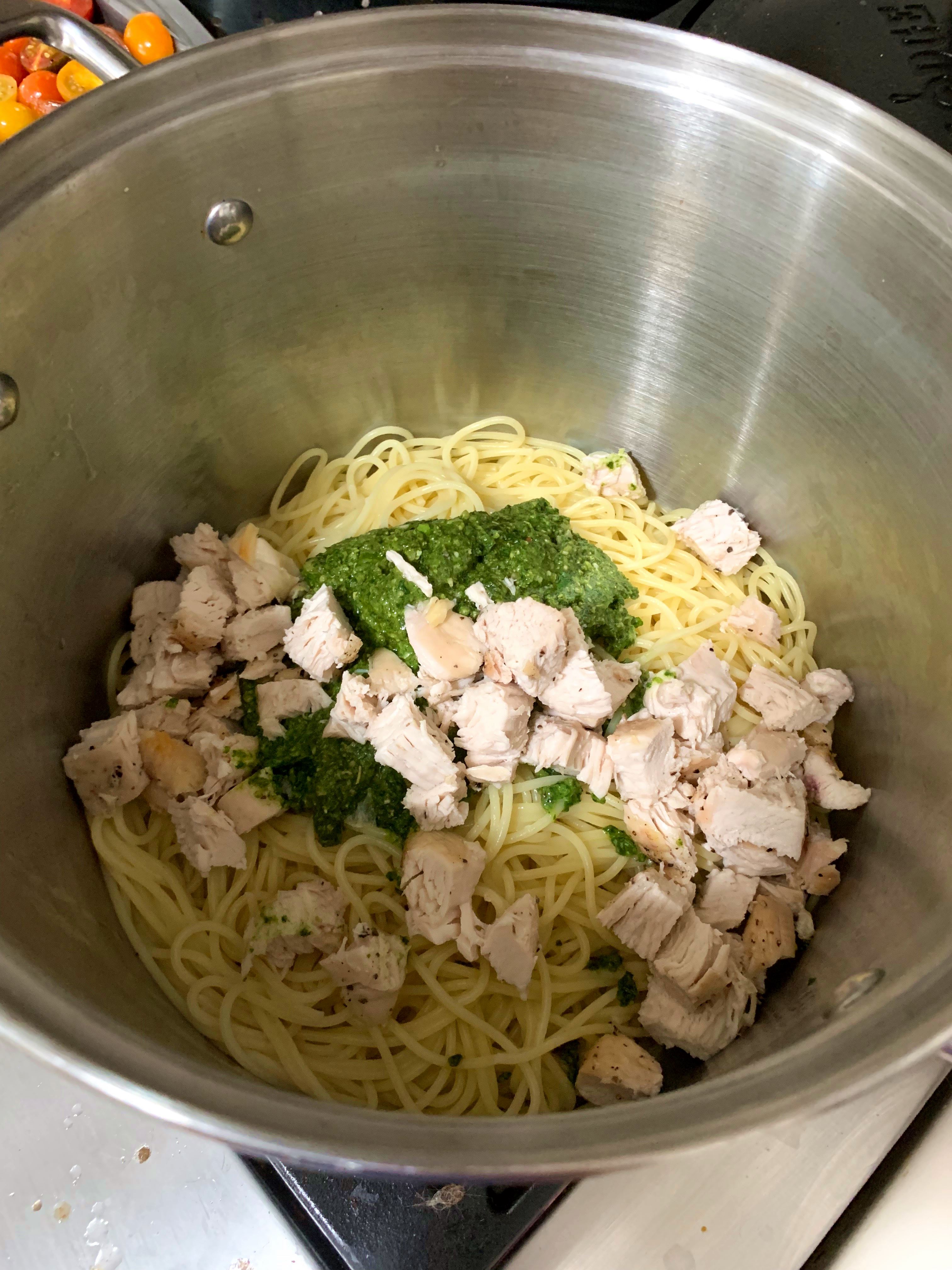 I usually prefer pesto with a curly pasta that can hold on to the pesto, but we had spaghetti noodles so that’s what we used. Pesto is so versatile and you can add it with whatever pasta you want, and top with extra veggies or a protein. We tossed the pasta, pesto, chicken, roasted tomatoes, and a little pasta water in the pan to coat the pasta.