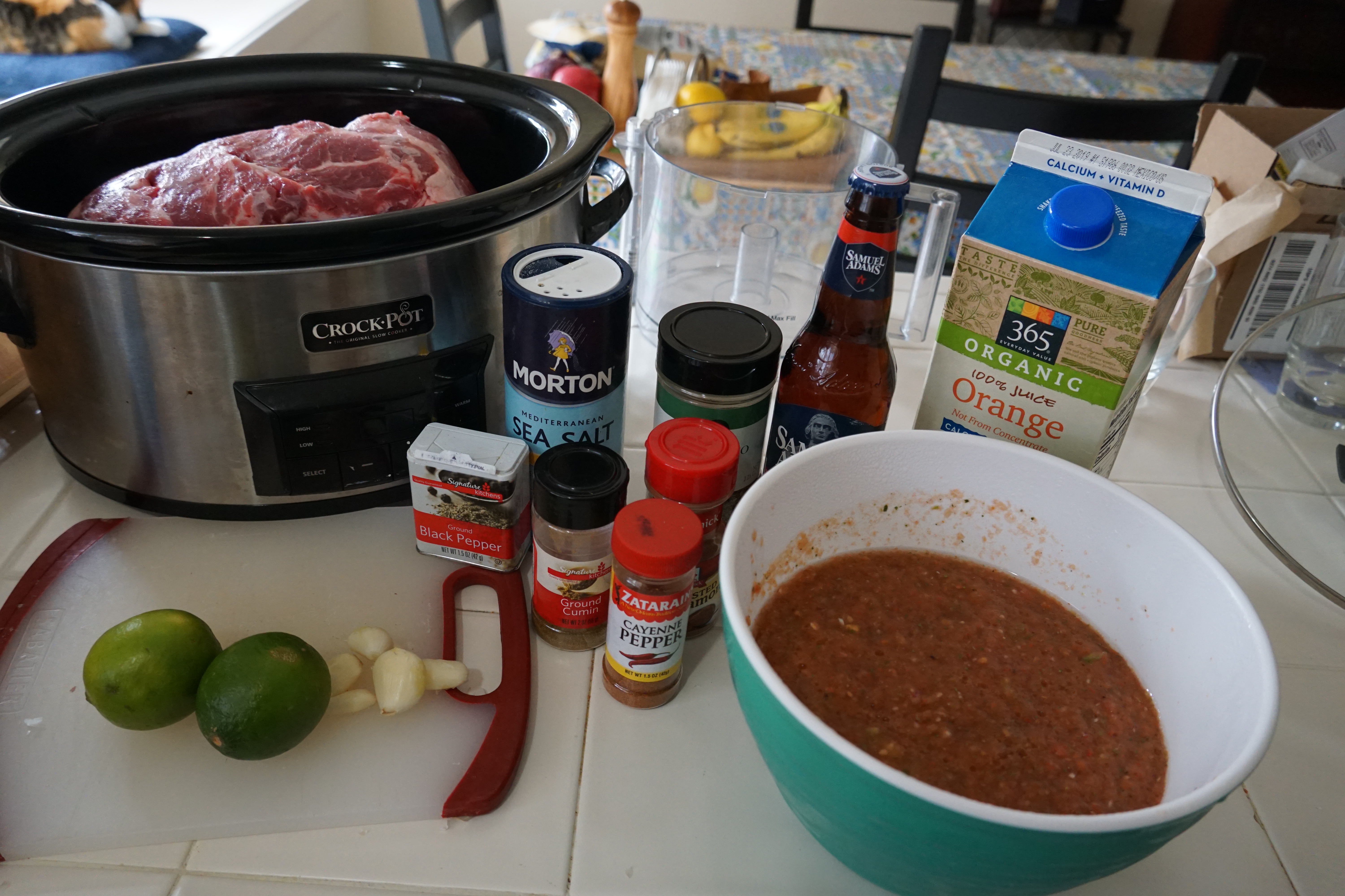 Add lime juice, orange juice, beer, and salsa around and on top of the pork. Set the timer for 8 hours and that’s it! Right before you serve, shred the meat and place on a baking sheet with some juices. Broil for 5 minutes or until the edges are brown.