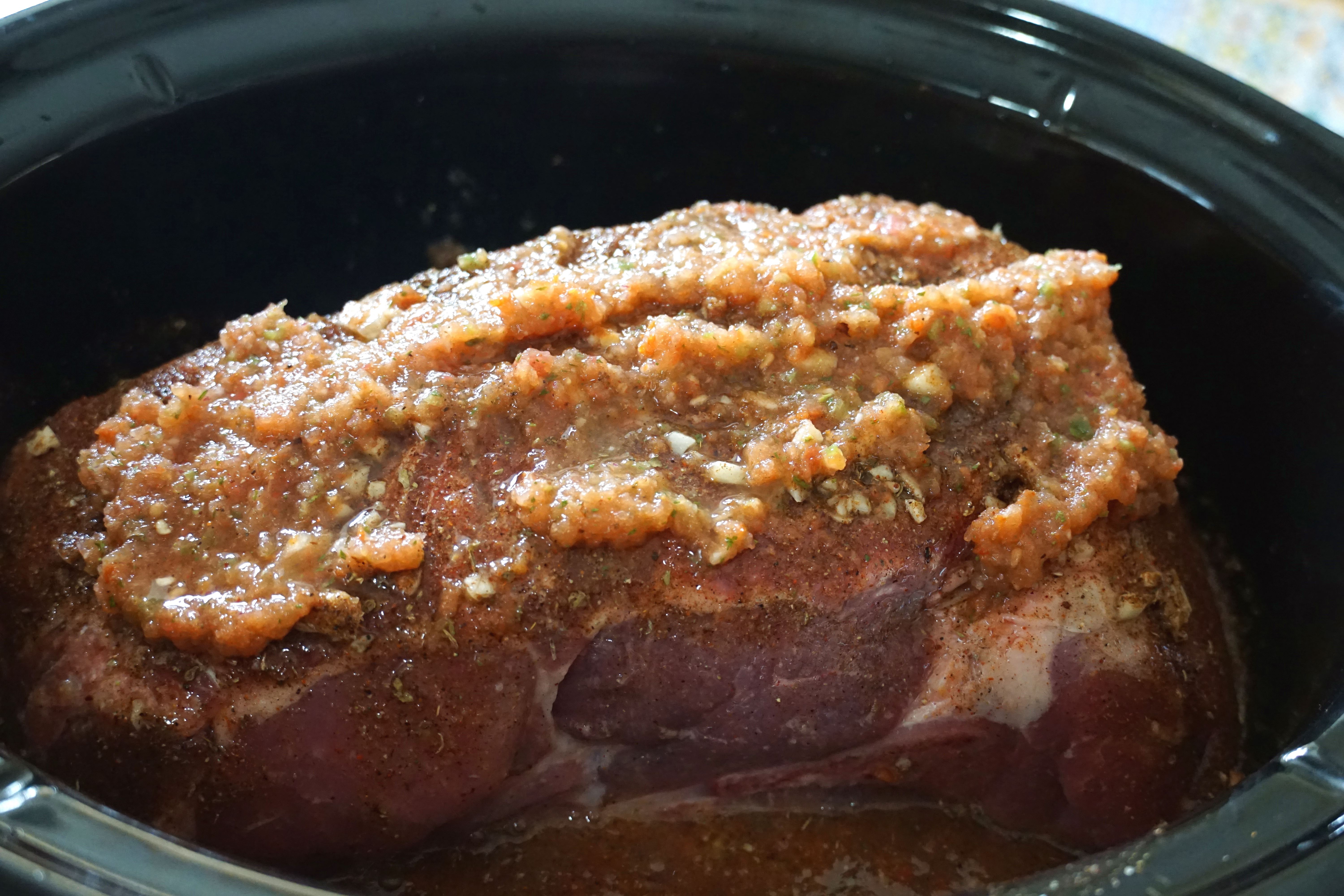 Once your pork is in the crockpot put the garlic on top and press into the meat. Combine salt, cumin, chili, pepper, oregano, cinnamon, and cayenne in a bowl and sprinkle all over the pork and garlic. Rub the seasoning mix onto the pork for good measure.
