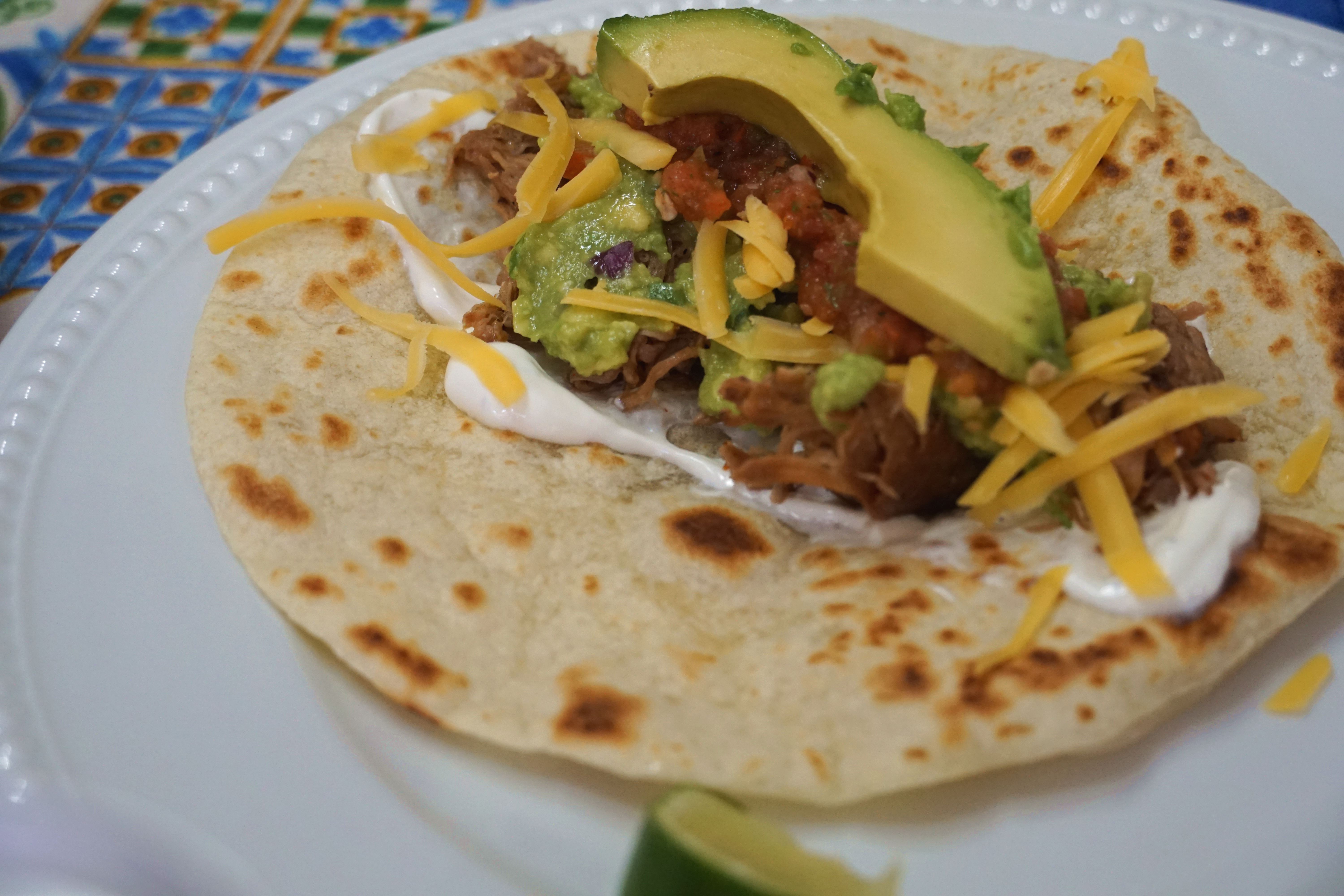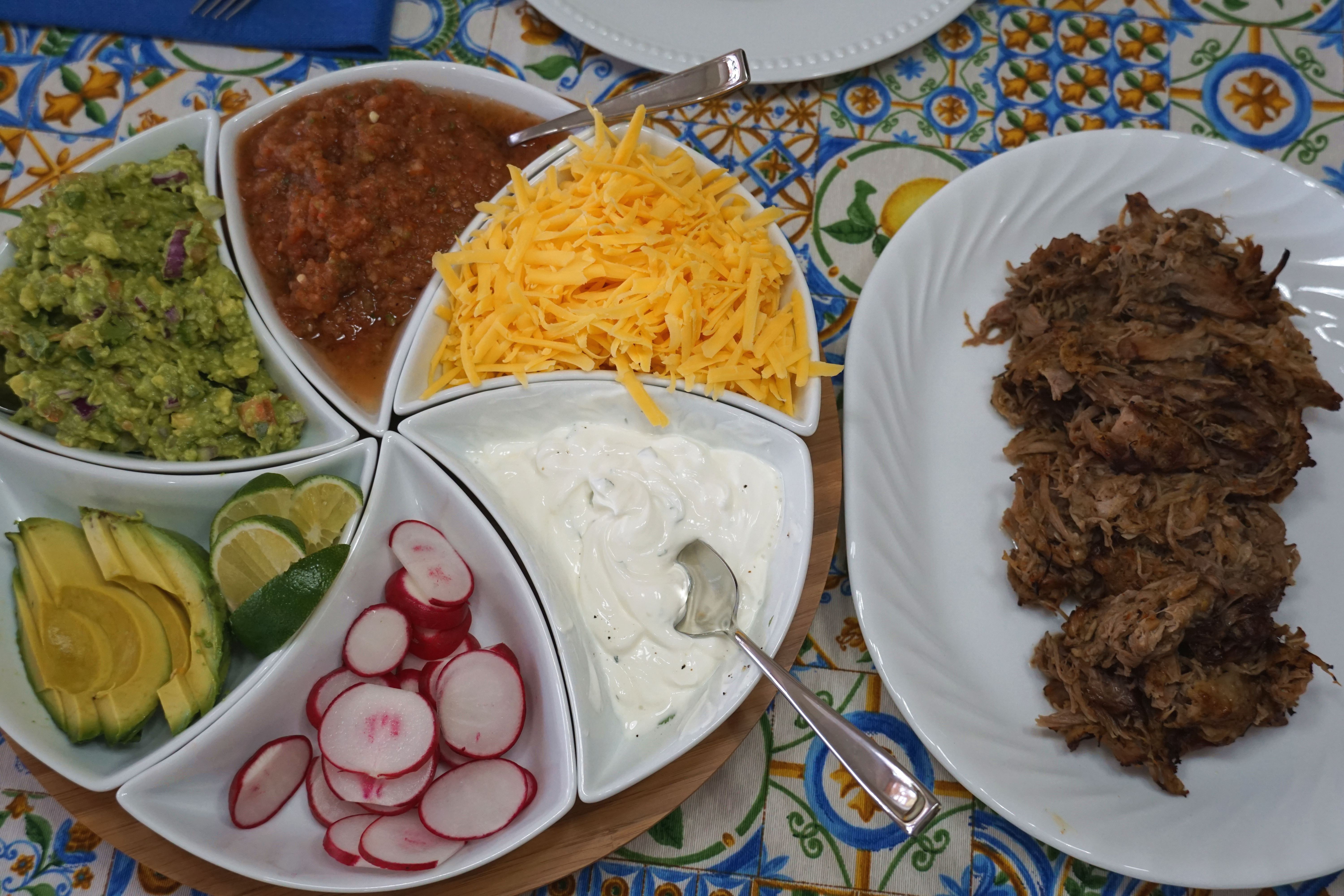 Tacos are a staple in our house! There are several different kinds we like to do, from an Asian inspired sesame taco to traditional ground beef. When we’re cooking for a crowd we like to do a slow cooker carnitas. We’ve made this for backyard parties, for friends who have had babies and it is always a hit. The best thing about this recipe is you put the pork shoulder in the crockpot, dump all the ingredients in, and then cook it until you get home from work.