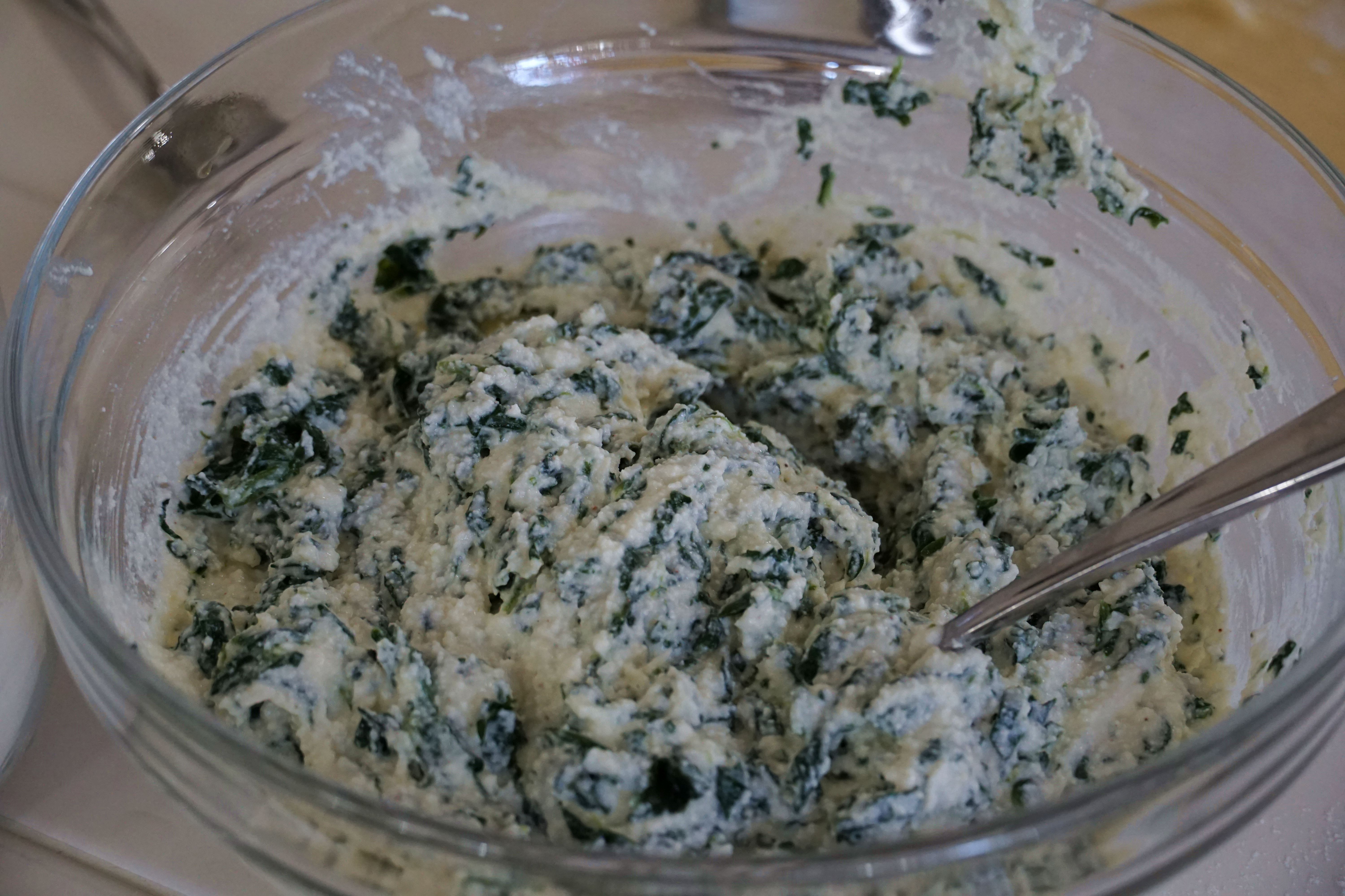 Combine spinach, ricotta, parmigiana, a sprinkle of nutmeg, the egg, salt, and pepper.