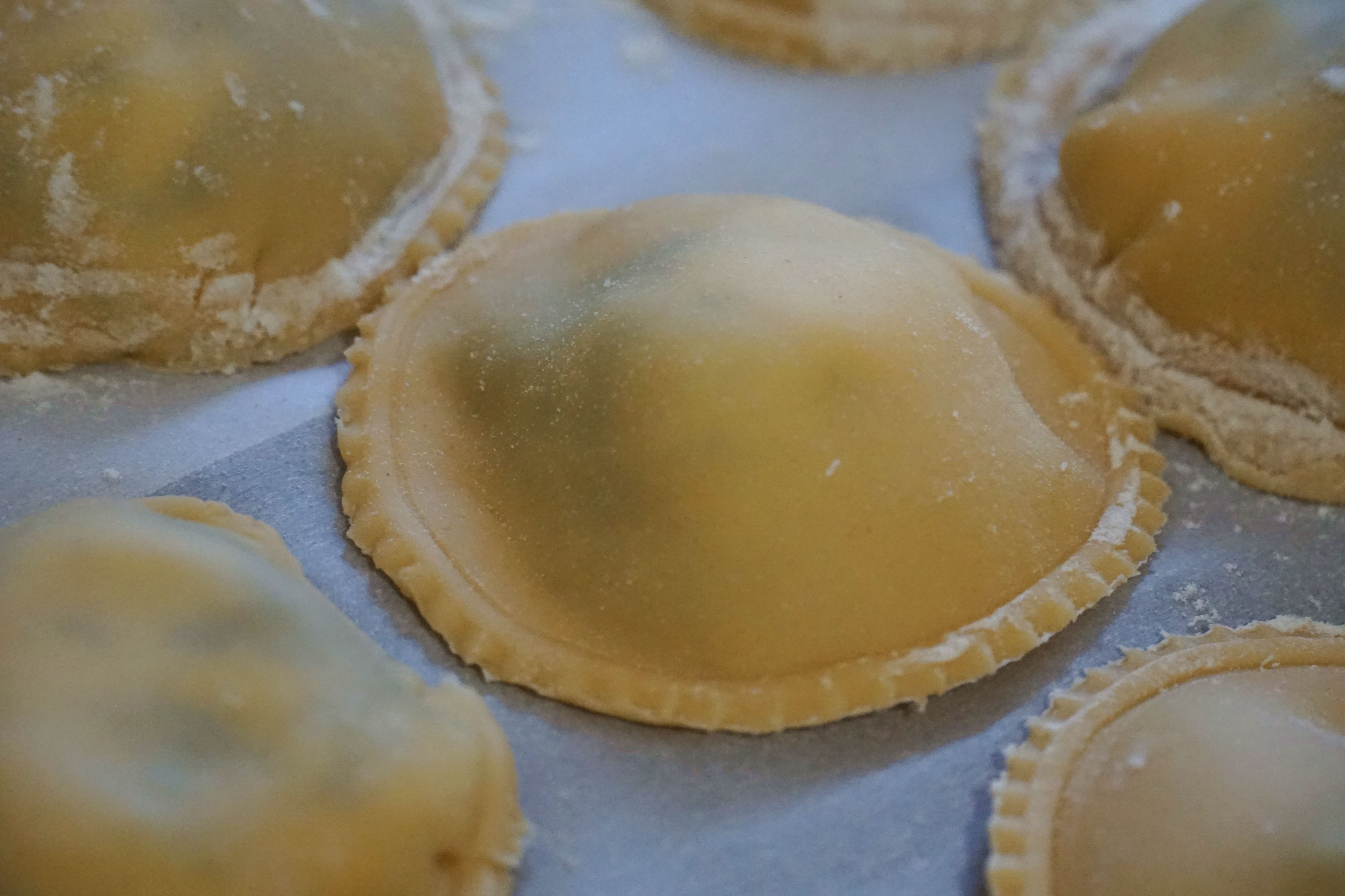 Place a tsp of filling on half of the sheet, fold the sheet over and press around the mounds. Using the ravioli cutter dipped in flour firmly press the cutter around the mound and twist until the dough comes free. Place on parchment paper lined baking sheets until ready to cook.