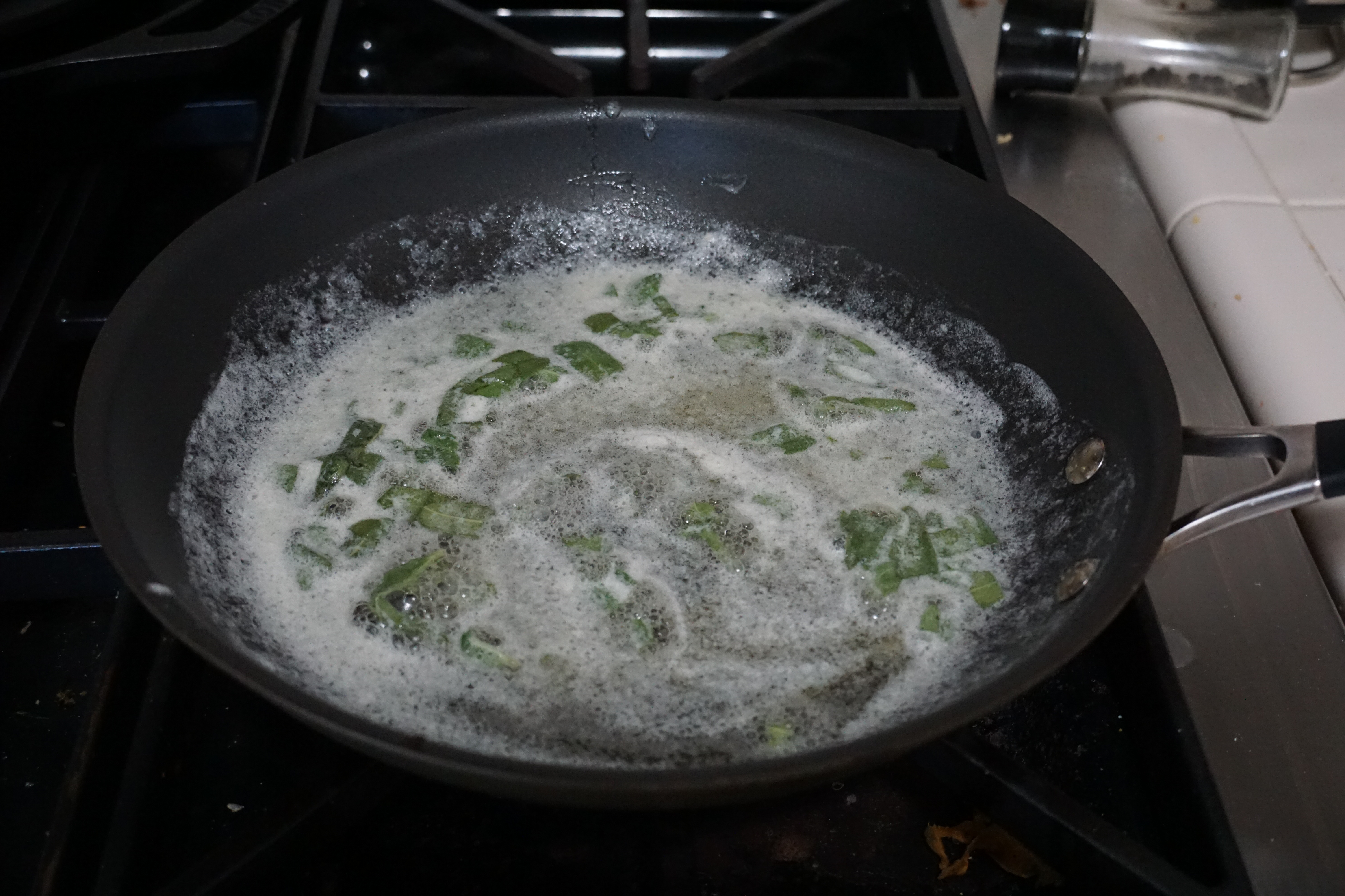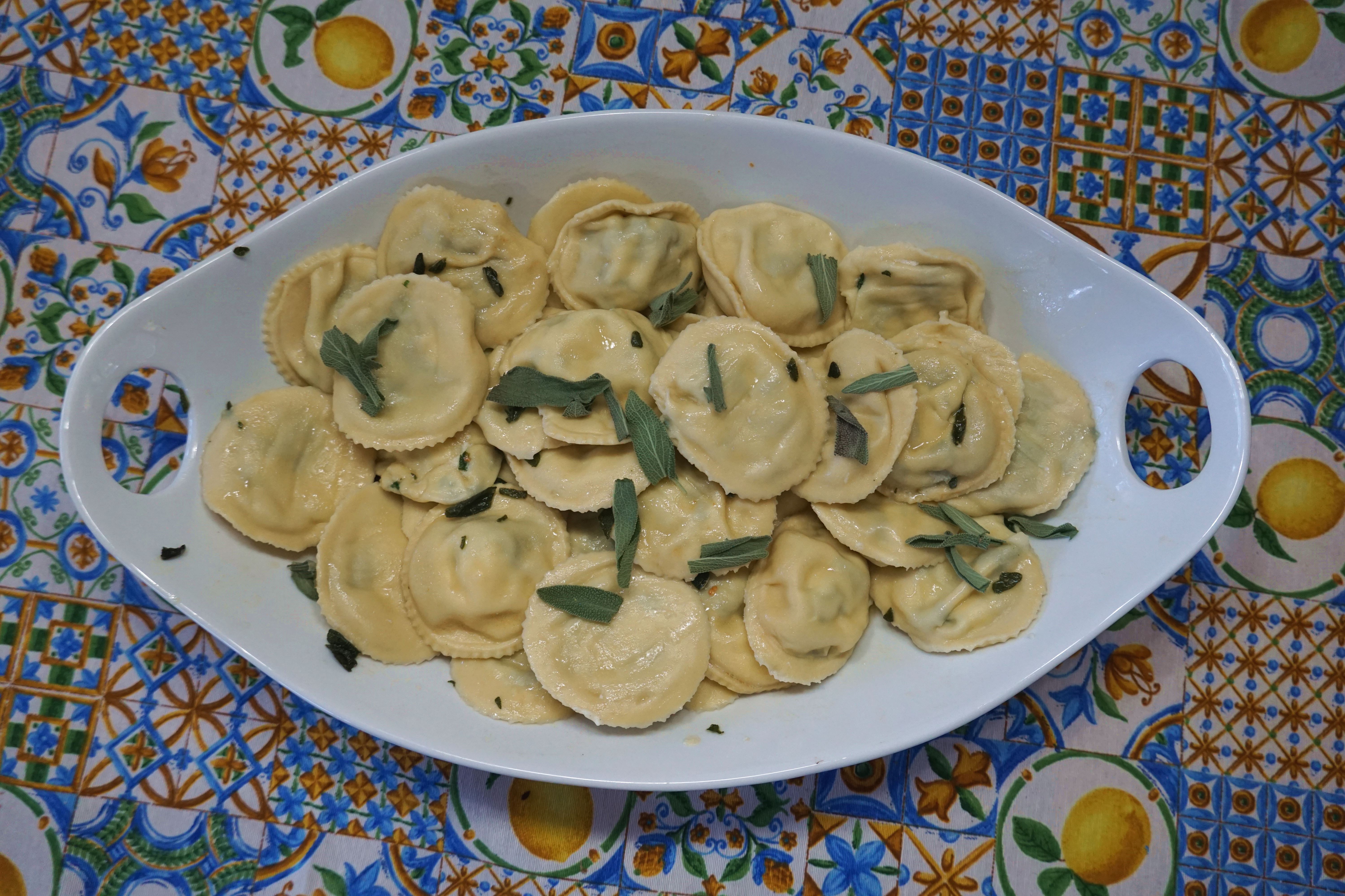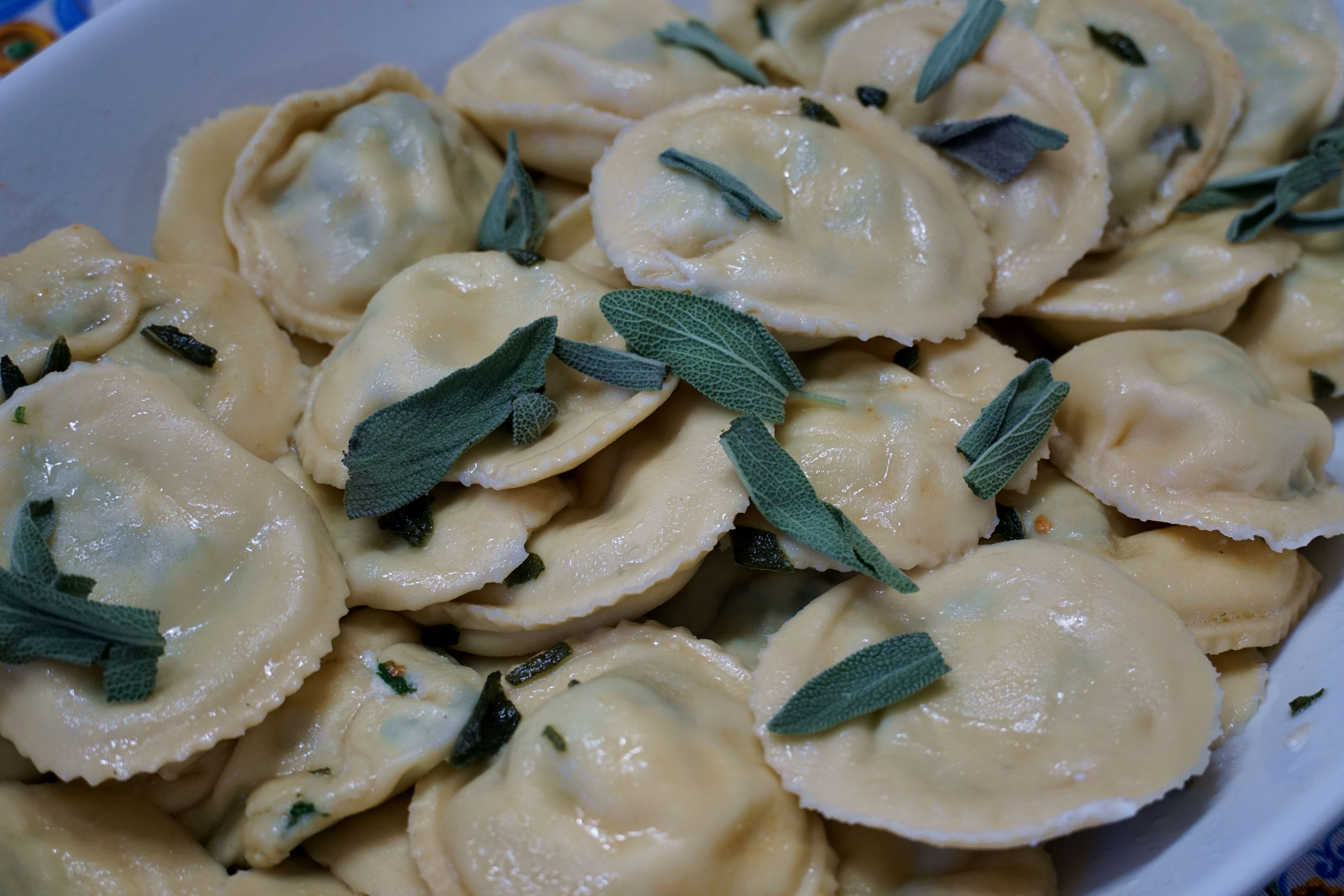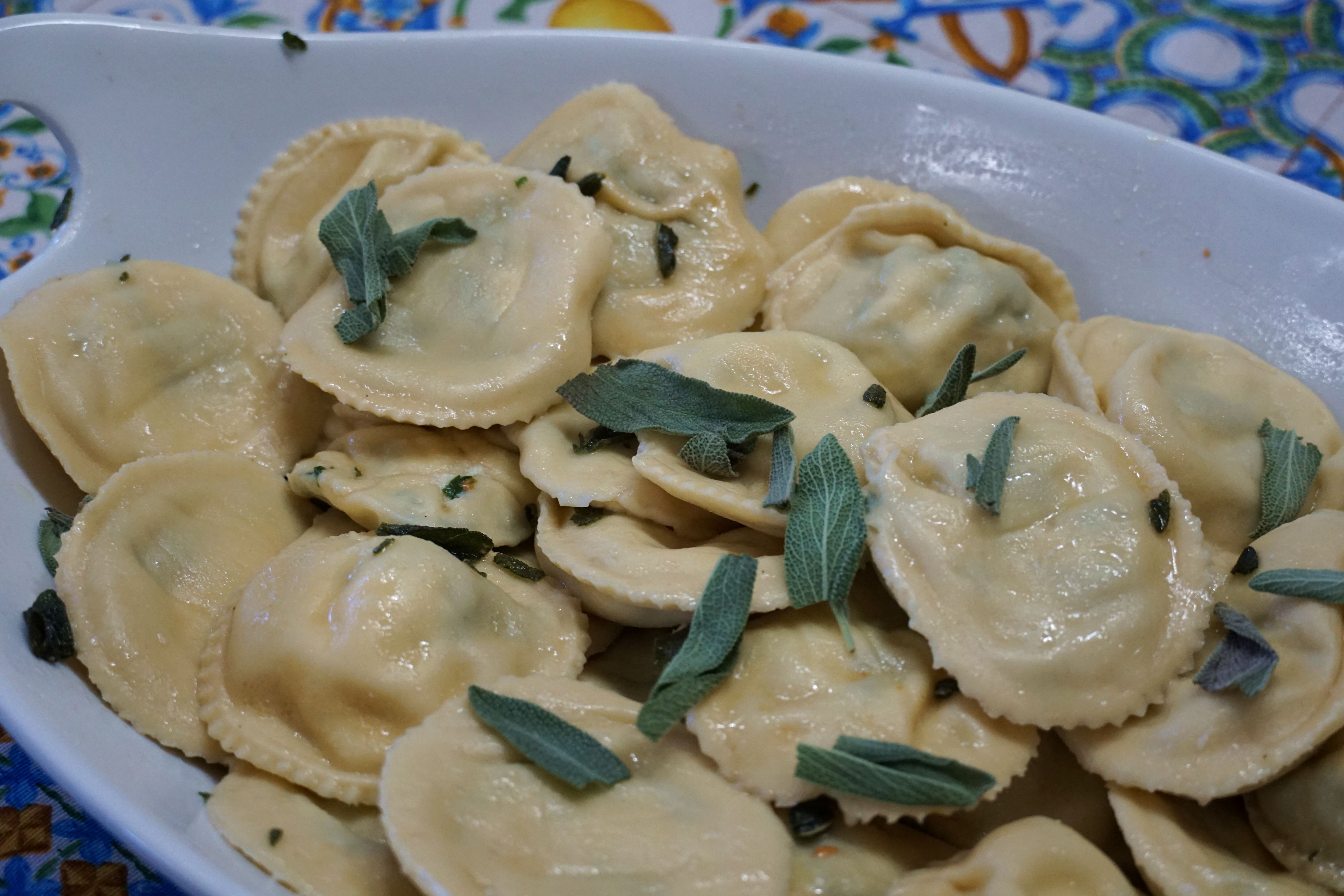 To make the sauce, melt salted butter in a pan with sage leaves until the butter is brown. Pour over cooked ravioli, adding a little pasta water. Top with grated Parmigiana and black pepper and you’re ready to eat!