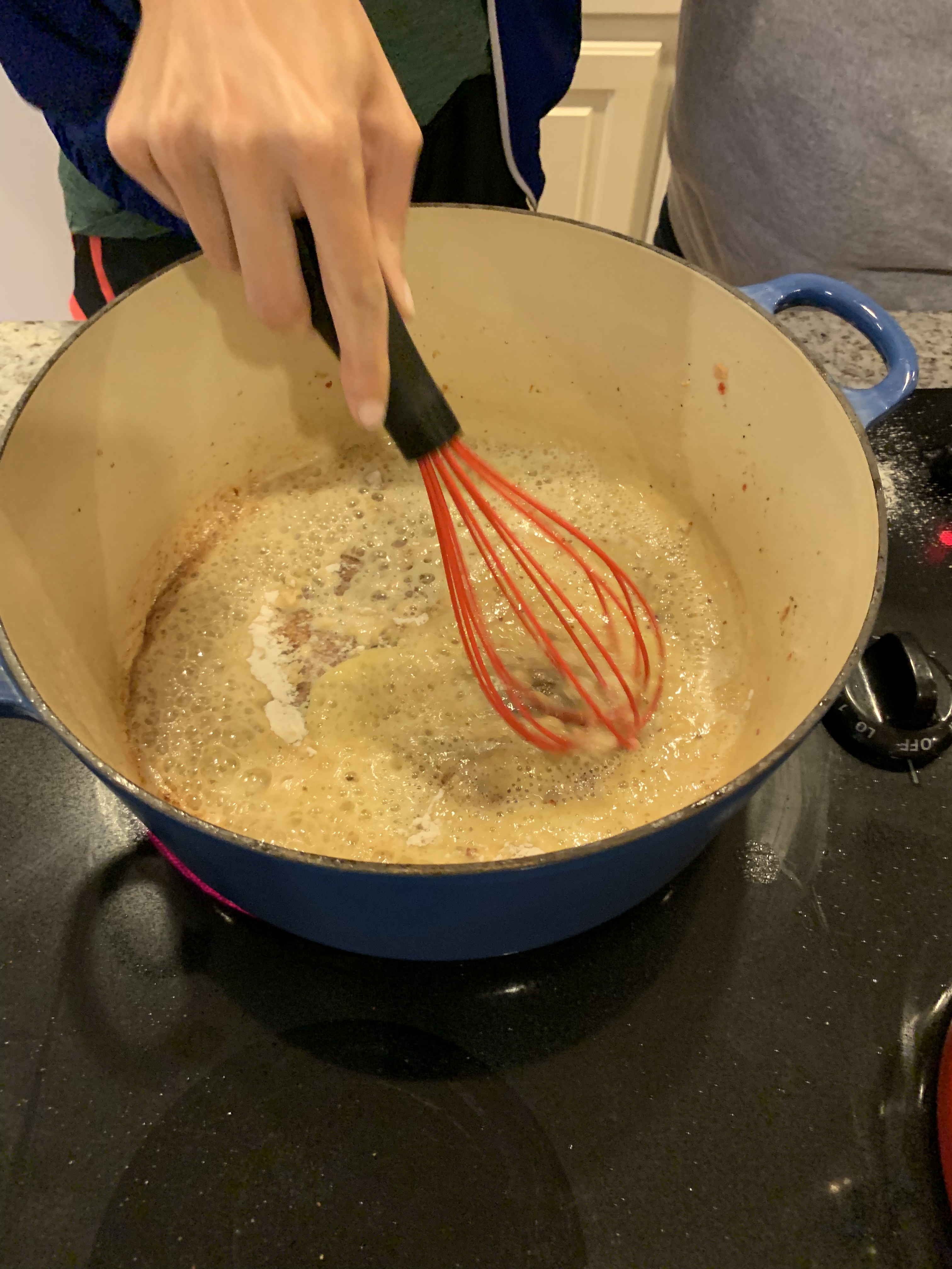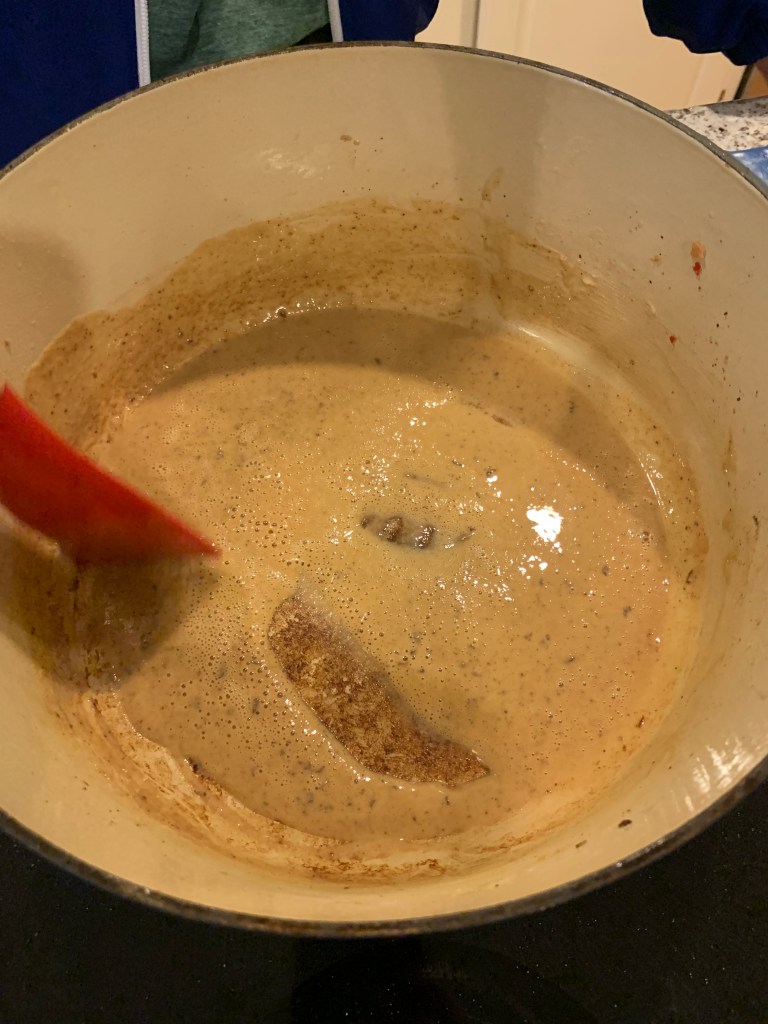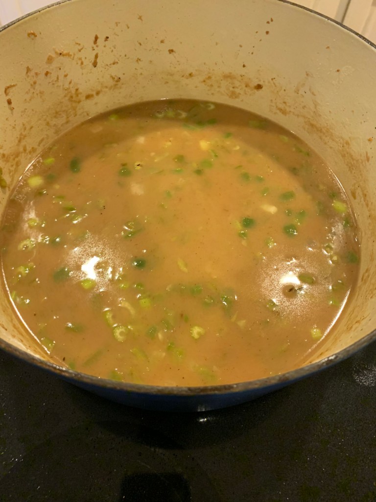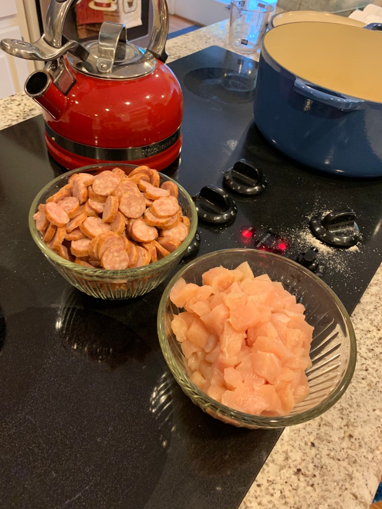 Using the fat from the chicken and sausage, add a little butter and let it melt. Using a little flour sprinkle it into the pan, scrapping the stuff from the bottom of the pan and then continuing to whisk constantly. You don’t want the roux to stick, which it will if you stop whisking. Continue to whisk until the roux has reached a deep brown color.