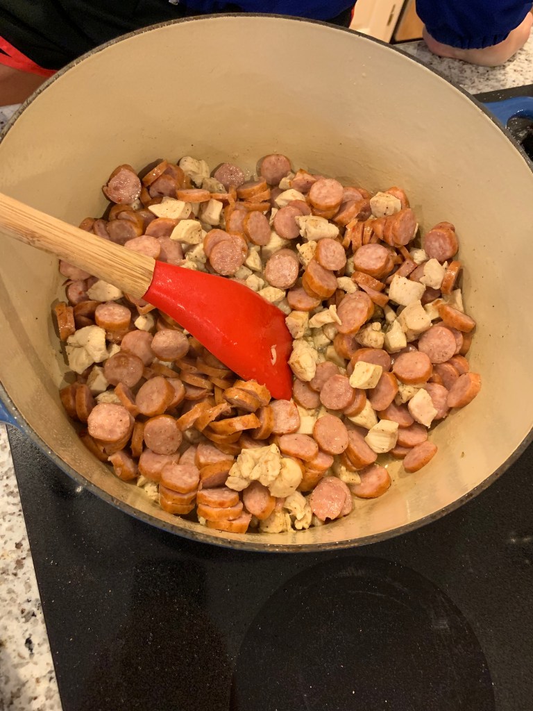 Using a large pot, heat your oil and add the chicken. Season with some salt, pepper, and poultry seasoning. Once cooked, add the sausage and cook for another few minutes. Transfer to a bowl.