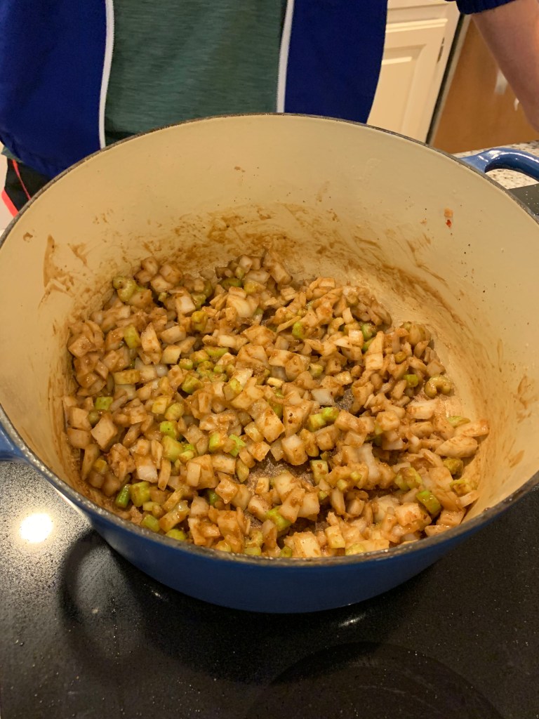 Add your vegetables (if you’re using frozen, only add the fresh right now!) and saute in the roux until softened. Go ahead and sprinkle some Cajun seasoning in there, it won’t hurt anything. Add your bay leaves and frozen vegetables, coating in the roux mixture. It’ll look chunky, and that’s ok!