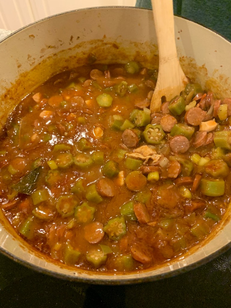 There are few things more special to me than spending time with my family. I don’t get back south very often, but when I do we make the most of it! Last time I went to my mom’s house, my sister came to join us for the weekend. Mom was wanting to make her normal gumbo, but my sister had other plans. My sister lives in New Orleans, and has learned some incredible techniques while there and was eager to apply them to mom’s gumbo. It was decided that we would do a roux based gumbo, which is definitely more time consuming, but so incredibly worth it. A roux is a mixture of fat and flour that can thicken up a dish and provide more flavor. Fair warning, this recipe doesn’t have a lot of measurements because the servings can be adjusted to what you want! For me, I add more okra and less onion, but the veggies are 100% your preference.