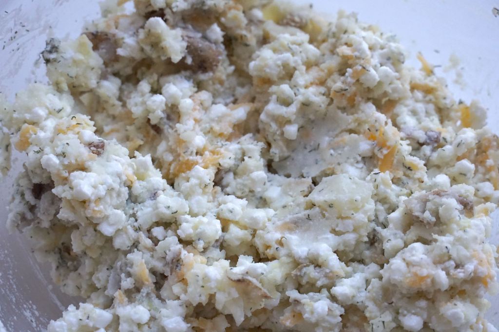 Boil your potatoes until easily pierced with a fork. Drain and mash, then mix in the cheeses, lemon juice, mustard, dill, and pepper. Combine and set aside while you work on your dough.