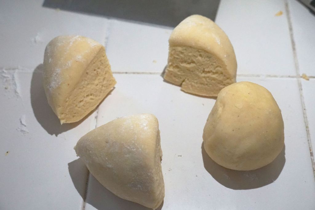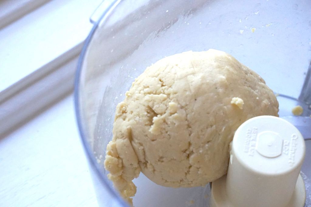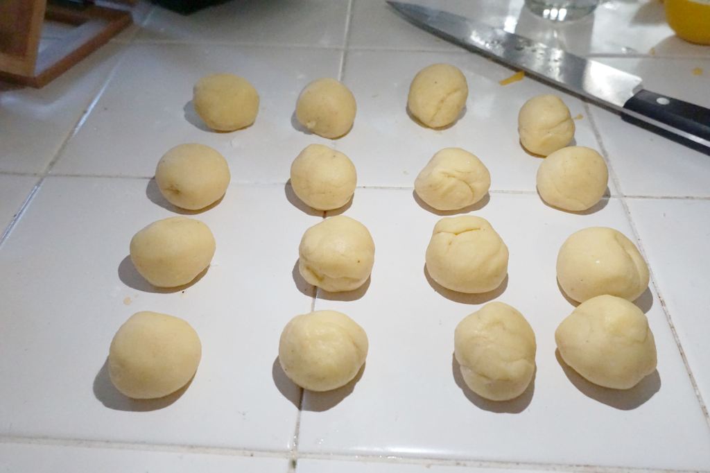 Combine flour, salt, and nutmeg into a food processor and combine. Add in the butter and combine, then add the eggs. Let it form a big ball, and then take it out and kneed it for a minute to make sure that everything is combined. Cut the dough into fourths, roll each fourth and then cut again until you have 16 small balls of dough.