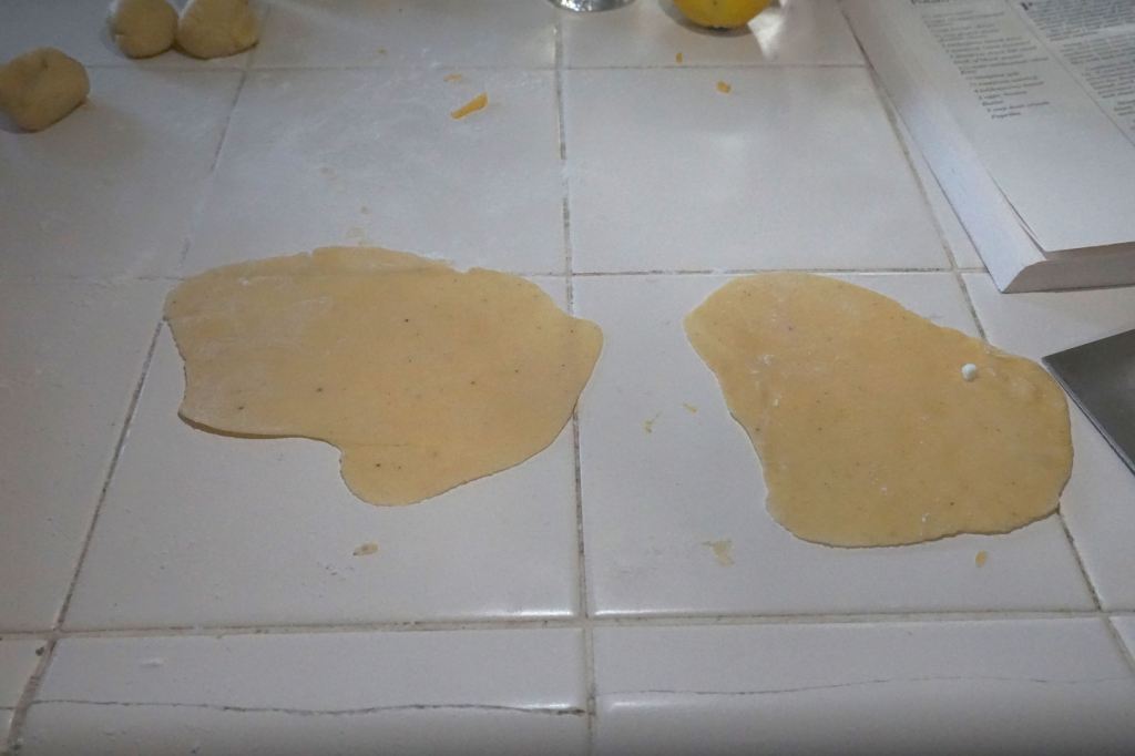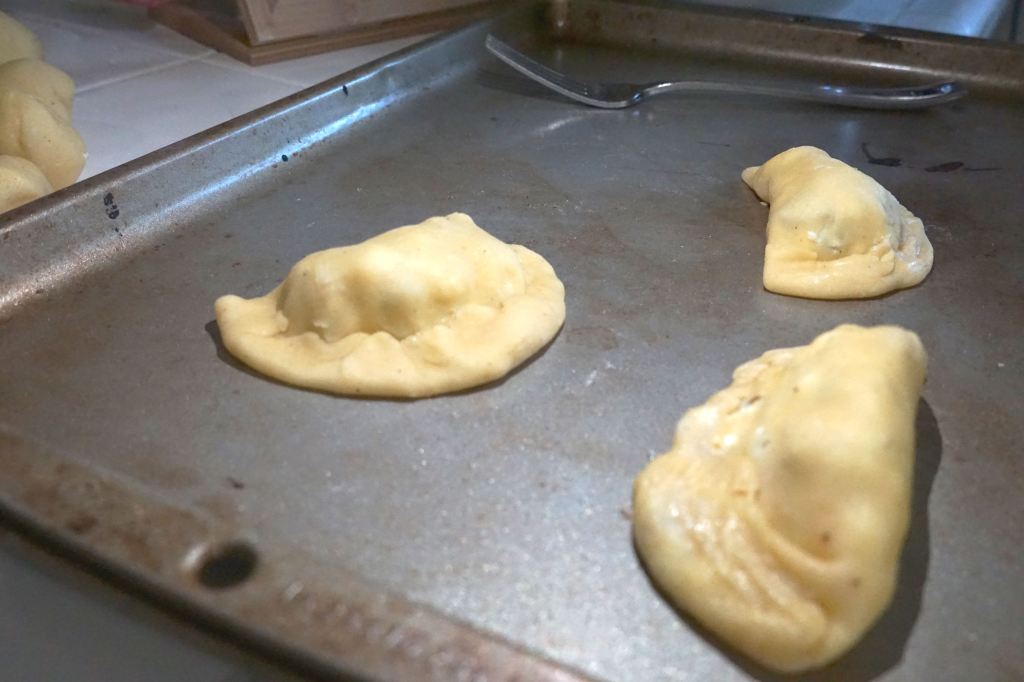 Roll them out into circle-ish pieces and put filling in the middle. Fold over, and seal with a fork that’s been dipped in water. Repeat until all the pierogis are full or you run out of something.