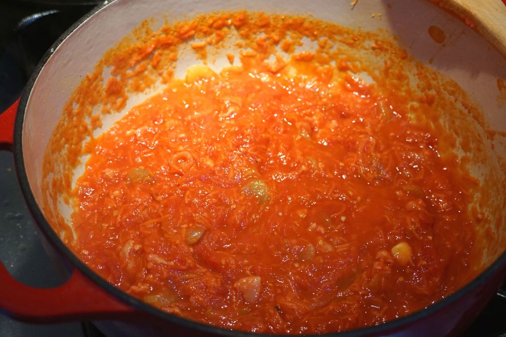 For the sauce: heat the olive oil and cook pancetta until slightly brown. Add celery, carrot, shallot, garlic, salt, and a little sugar. Cook until the shallots are translucent, and add the tomatoes with their juices. This will simmer for about 15 minutes, which allows you to break the tomatoes up into smaller pieces.