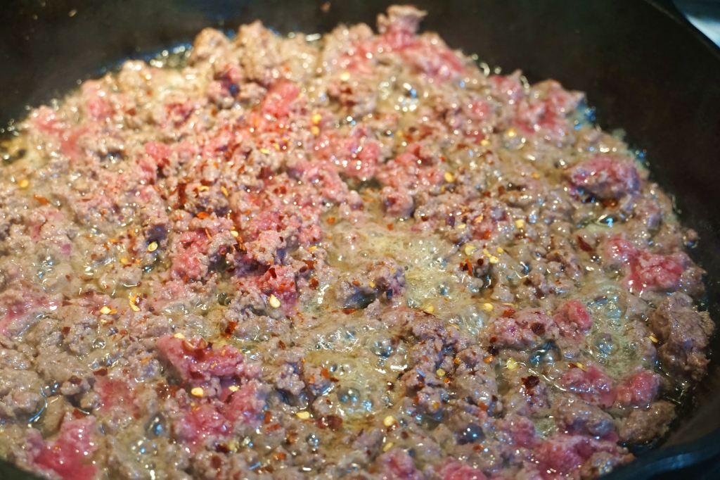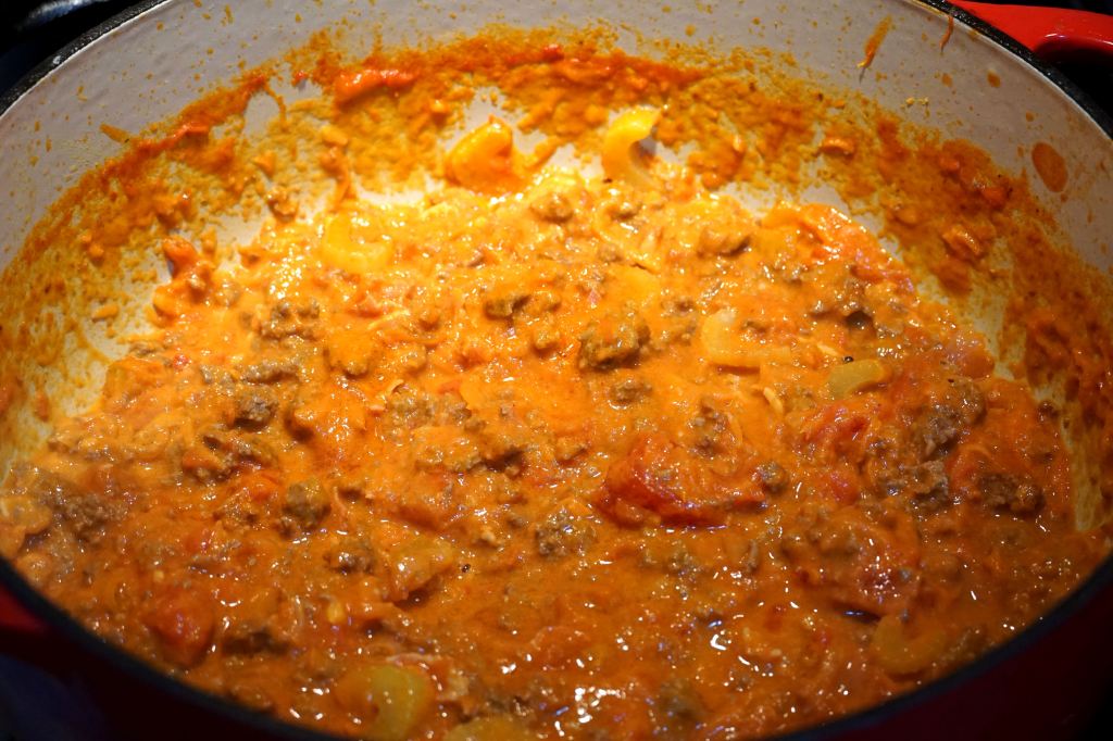 While the tomatoes are simmering, cook the beef with salt until browned. Then add your red pepper flakes and white wine. Simmer until the wine has cooked out. Add to the tomato sauce, along with the heavy cream. Everything can hang out together until the pasta has been cooked and some pasta water saved.