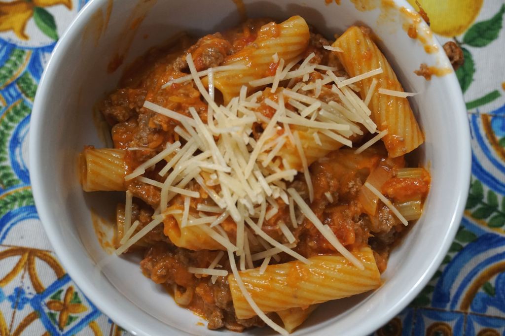 The colder nights have me craving a big bowl of pasta or soup. The days have been in the high 60’s here, which makes both hard for me to wrap my head around! I decided to start off easy with a veggie loaded bolognese pasta, but be on the lookout for soups coming soon. This pasta is hearty and filling with its creamy sauce. The rigatoni catches all the chunks of meat and vegetables inside, and makes for the perfect bite every time.