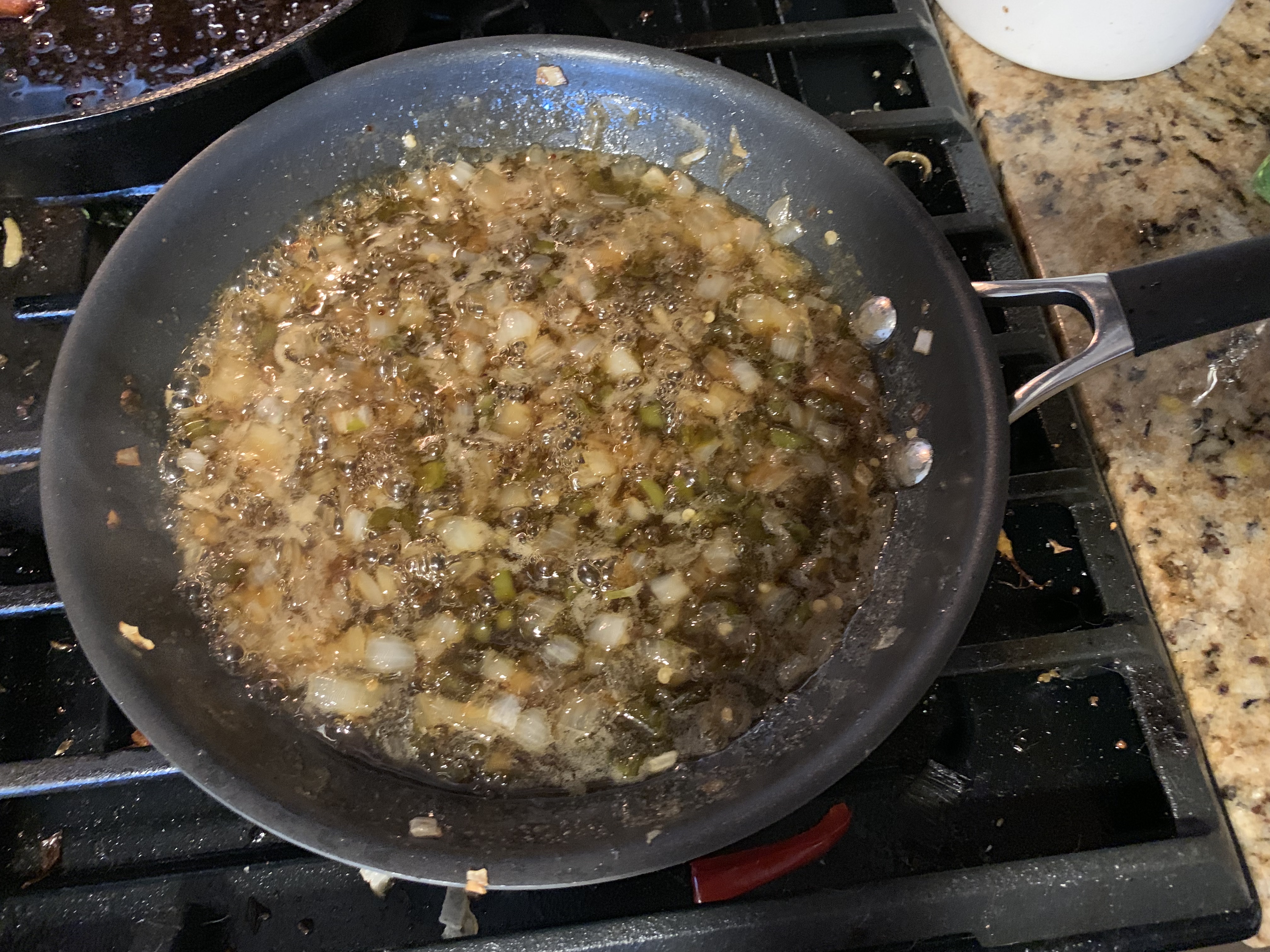 Melt the butter over medium heat in your pan. I used our non-stick for this, because I wasn’t sure if it would be easy to clean up! Once the butter is melted, add your onions and cook until translucent. When those are done, toss in your brown sugar, jalapenos (juice and all!) and mustard. Cook until boiling, and then reduce heat and simmer until it is thick enough to drizzle. Store in an airtight container and cool before eating.