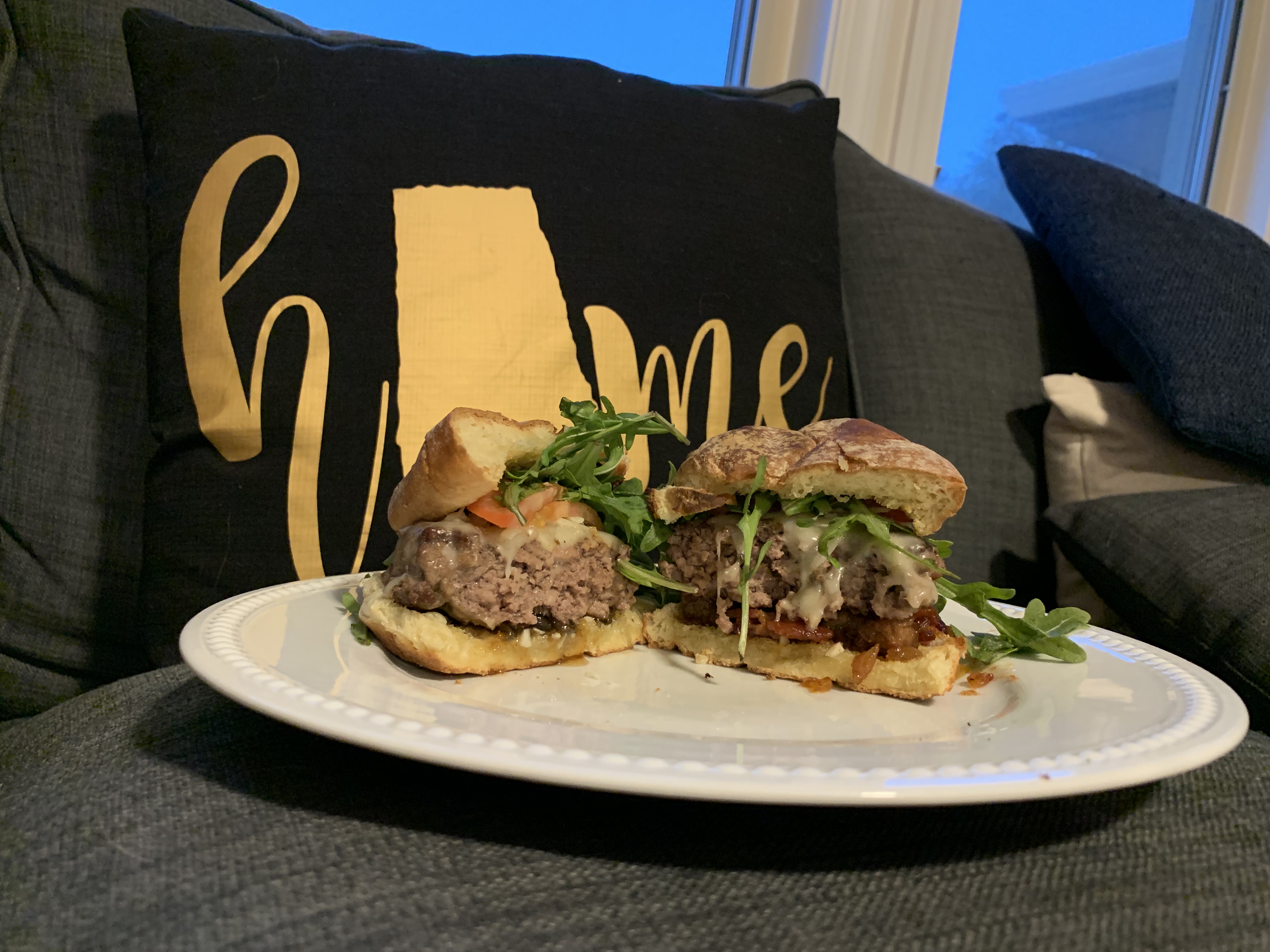 Who doesn’t love a good burger? They’re so easy to make and incredibly versatile. I like to make them with red onions cooked in balsamic vinegar on top or put cheddar cheese inside the burger so that each bite gives you that extra zing of sharp cheddar. This week, we went for a more basic burger, with Gruyere, garlic butter buns, and piled high with arugula and tomatoes. We decided to spice these burgers up with two different drip jams: bacon and jalapeno. Both had their perks, but we both agreed that the jalapeno was more up out ally. I’ll share both, and you tell me which you prefer! What appealed to us the most about the jalapeno jam was the heat from the jalapenos, paired with the sweetness of the brown sugar, and all with that crisp, peppery bite of arugula. The bacon jam was thick, and not as saucy, but added some good smokey flavor to the meat.