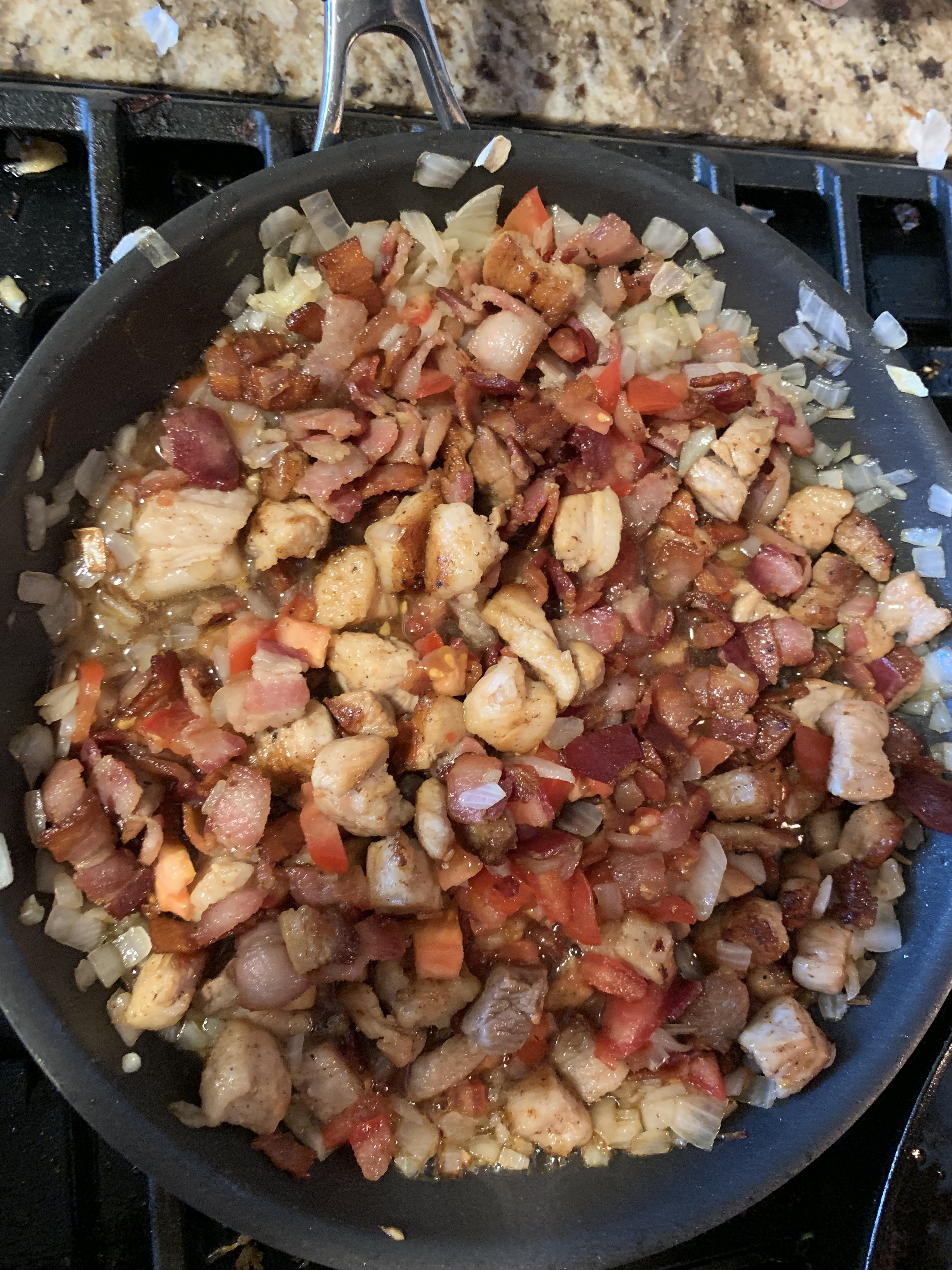 In a different pan (I used a large, non-stick here) melt your butter, then add garlic and saute for a minute. Once the garlic smells good, add your onions and stir until brown. Toss in the bacon, pork belly, tomatoes, brown sugar, 1/2 cup of water and bring to a simmer. When it is simmering, reduce heat and cook until thick and full of flavor.